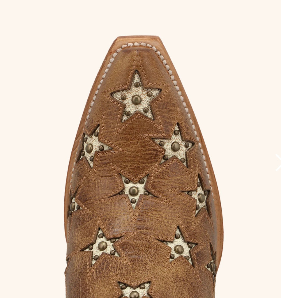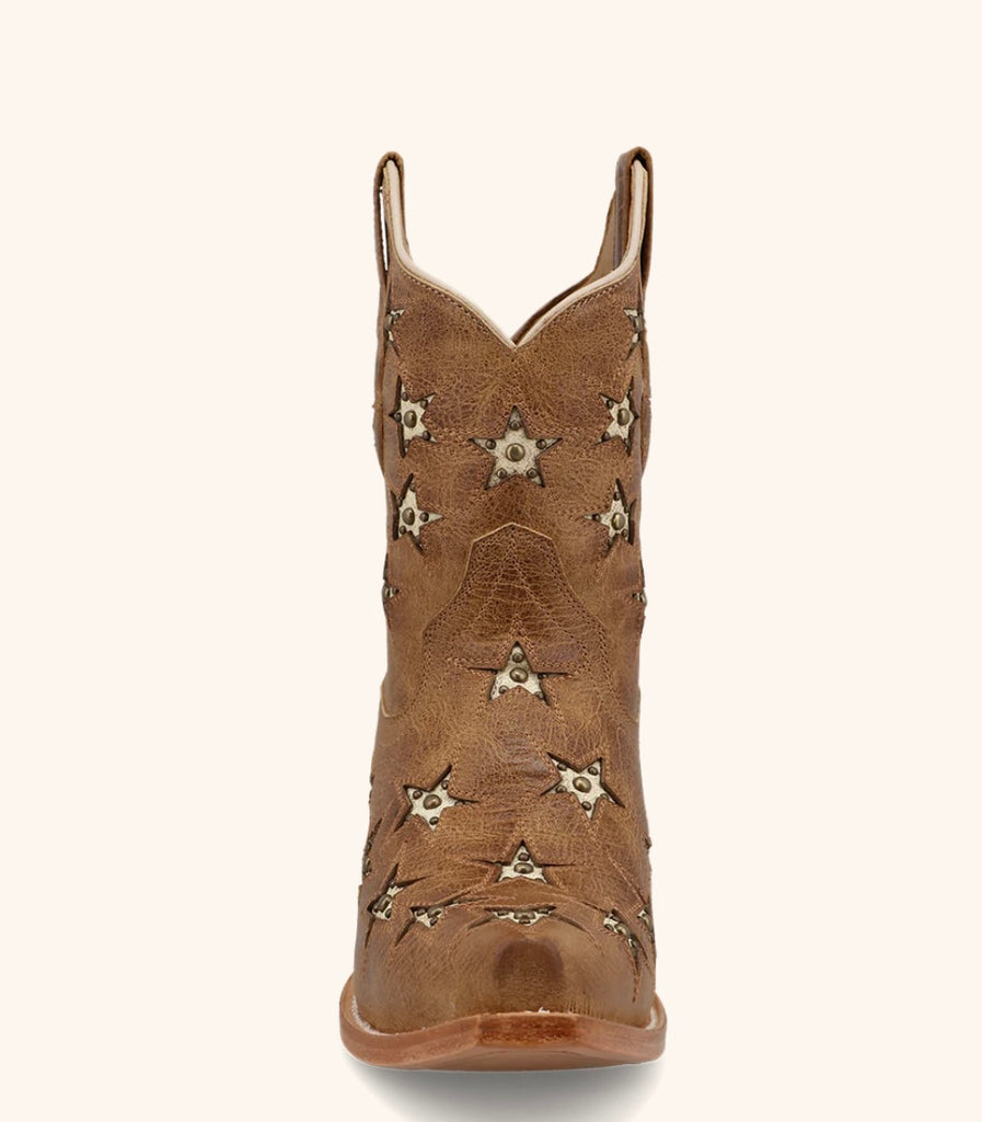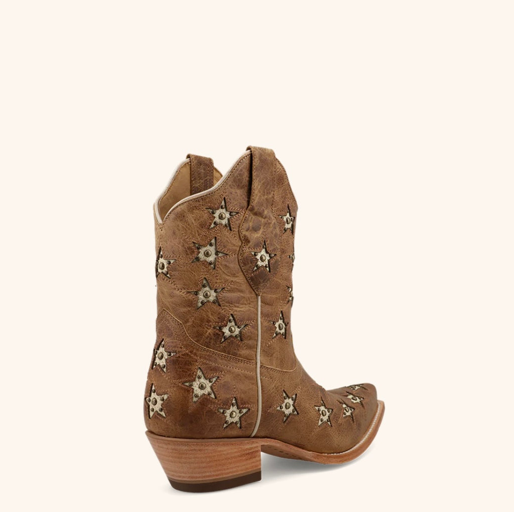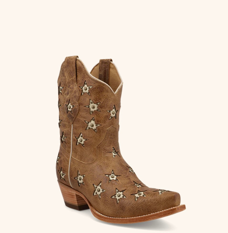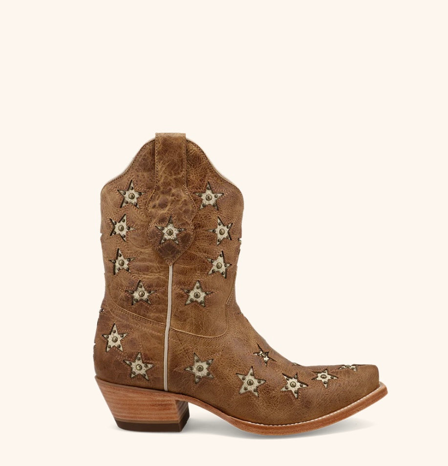 Find comfort in the stars with this Marfa bootie. Dressed in a beautiful Caramel full-grain leather and adorned with white crackle inlay stars and studded embellishments, you are sure to turn heads in this showstopper boot. The Marfa bootie features a 9" shaft height, 1.75" western heel, and snip toe for a sleek profile design. The Marfa bootie is just as comfortable as it is beautiful thanks to a cushioned footbed and soft leather lining.