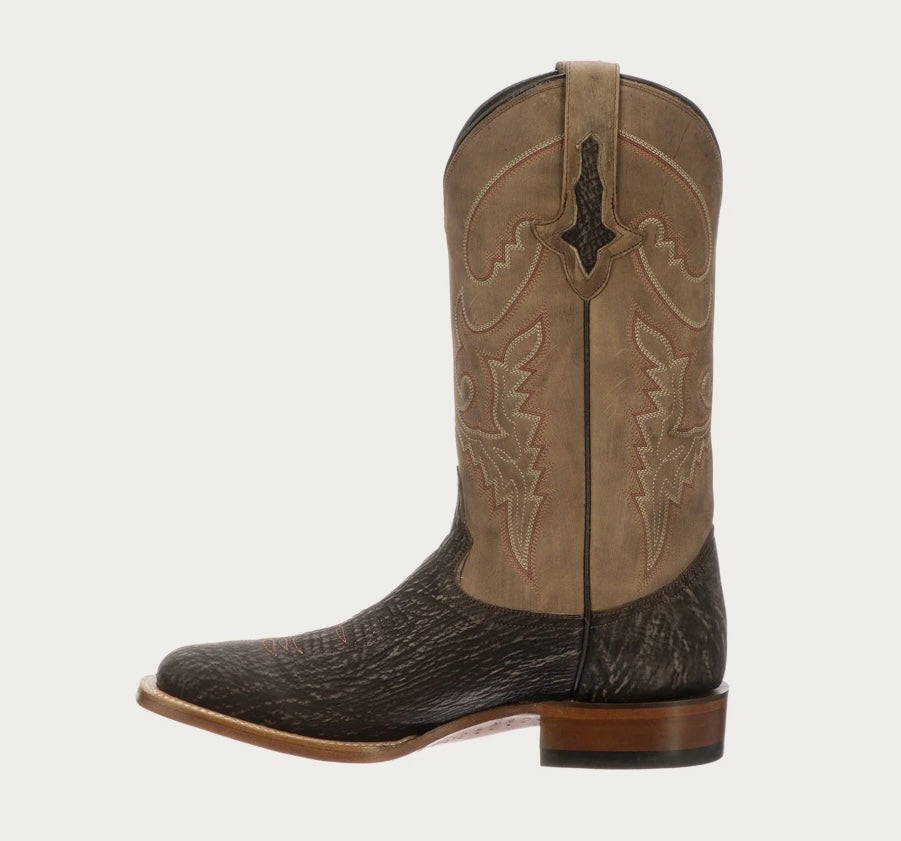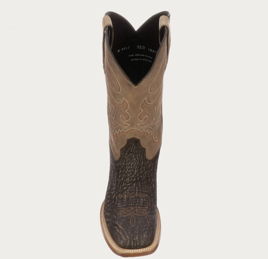 Ryan is a classic horseman boot with exotic bite. Constructed with sanded sharkskin, this boot features traditional stitch patterns, detailed pull straps, burnished touches and a classic toe bug. Double stitch welt construction. Leather sole. Handmade in Mexico.