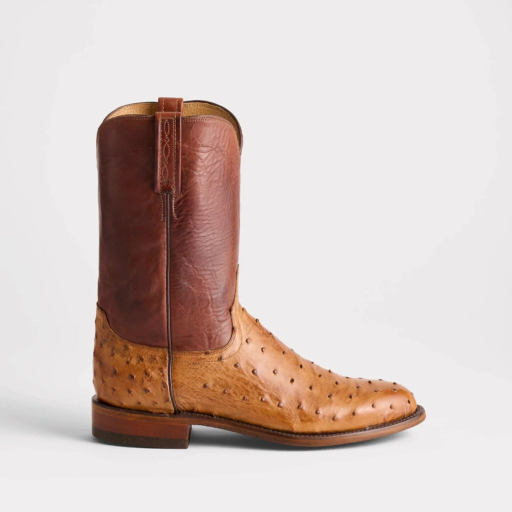 The Zane is a roper made up of hand stained Full Quill ostrich vamps and Ranch Hand quarters. A low roper heel offers a seamless transition from pasture to pavement. The Zane is a nod to the cowboys who roamed the American West. Handmade in Texas.