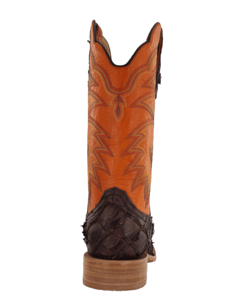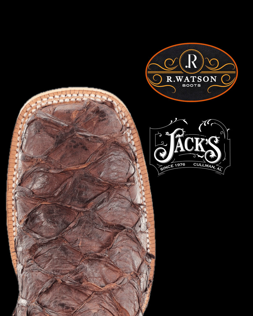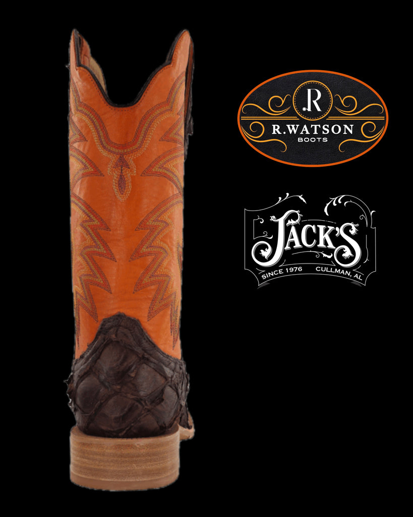 R. Watson presents these pirarucu western boots. These boots have a 10 row stitch pattern, R. Watson comfort system, all leather stacked heel, counters, solid steel shank, and hybrid outsole. 13″ total in height