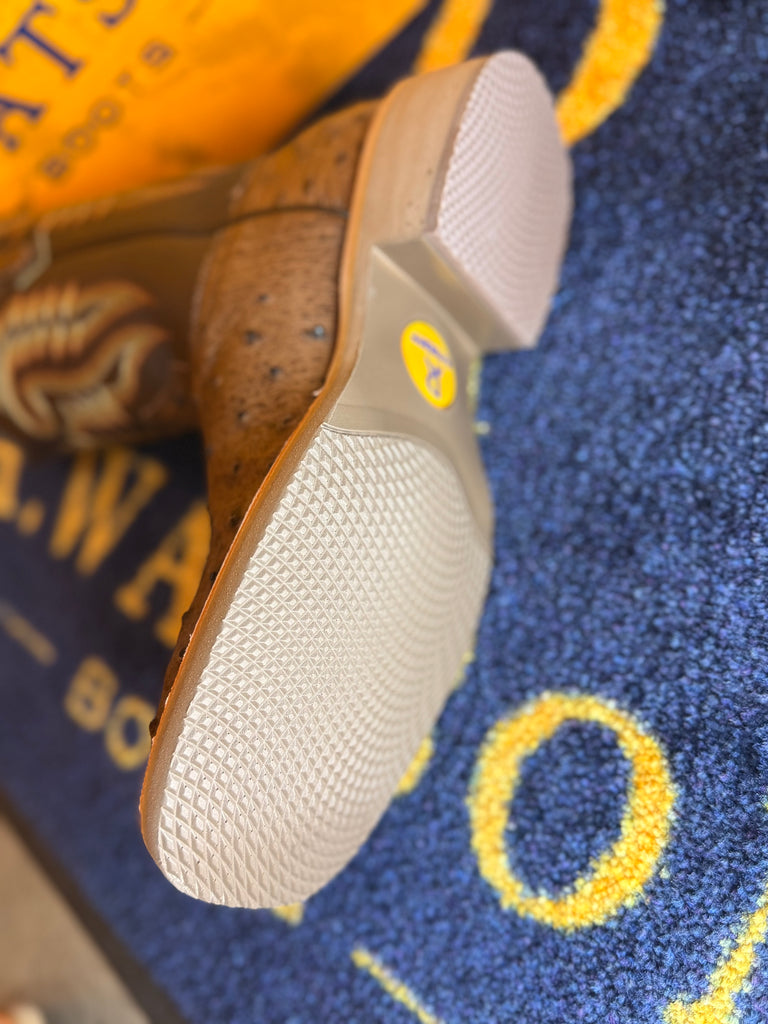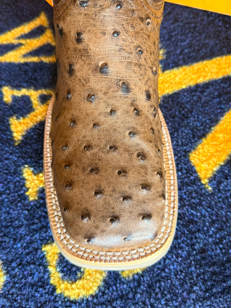 Experience unmatched style and comfort with these men's boots featuring a full quill ostrich vamp in antique saddle color. Crafted with a tan goat leather top and a wide square toe, they offer a distinctive look and roomy fit. The 11" height and crepe outsole provide durability and reliable traction, making them perfect for all-day wear. Elevate your wardrobe with these expertly designed boots that combine premium materials and classic Western craftsmanship.