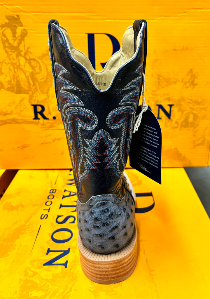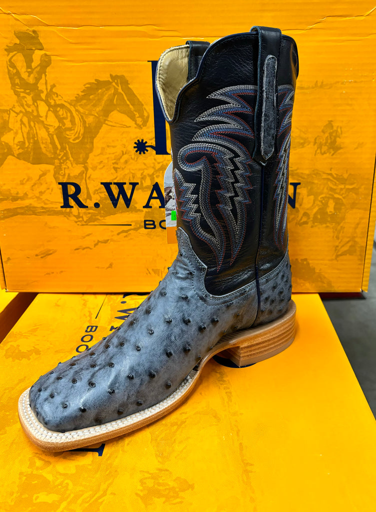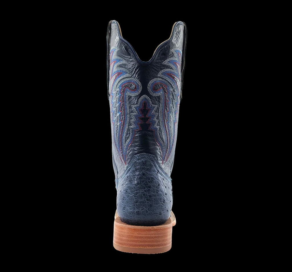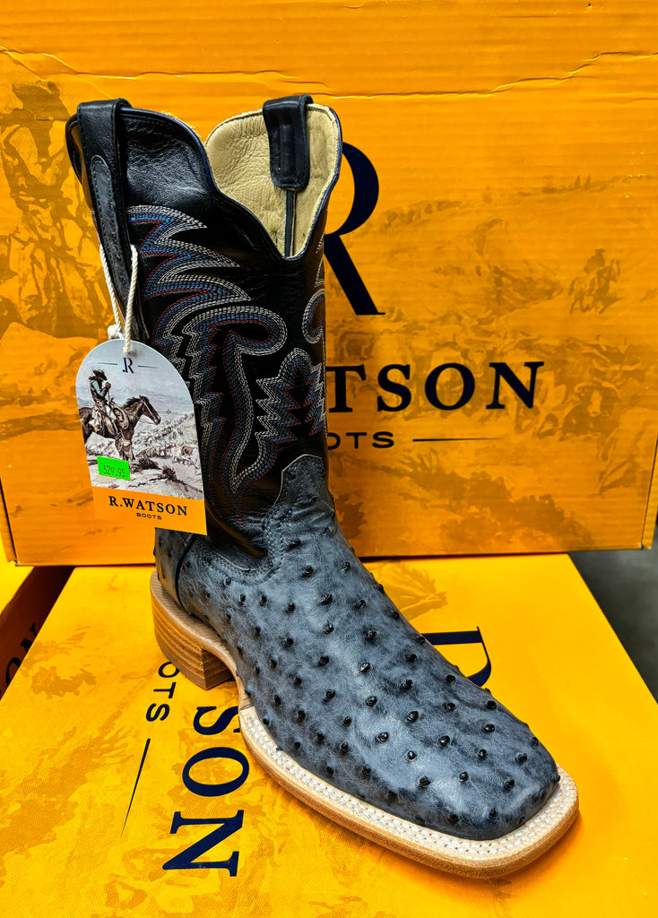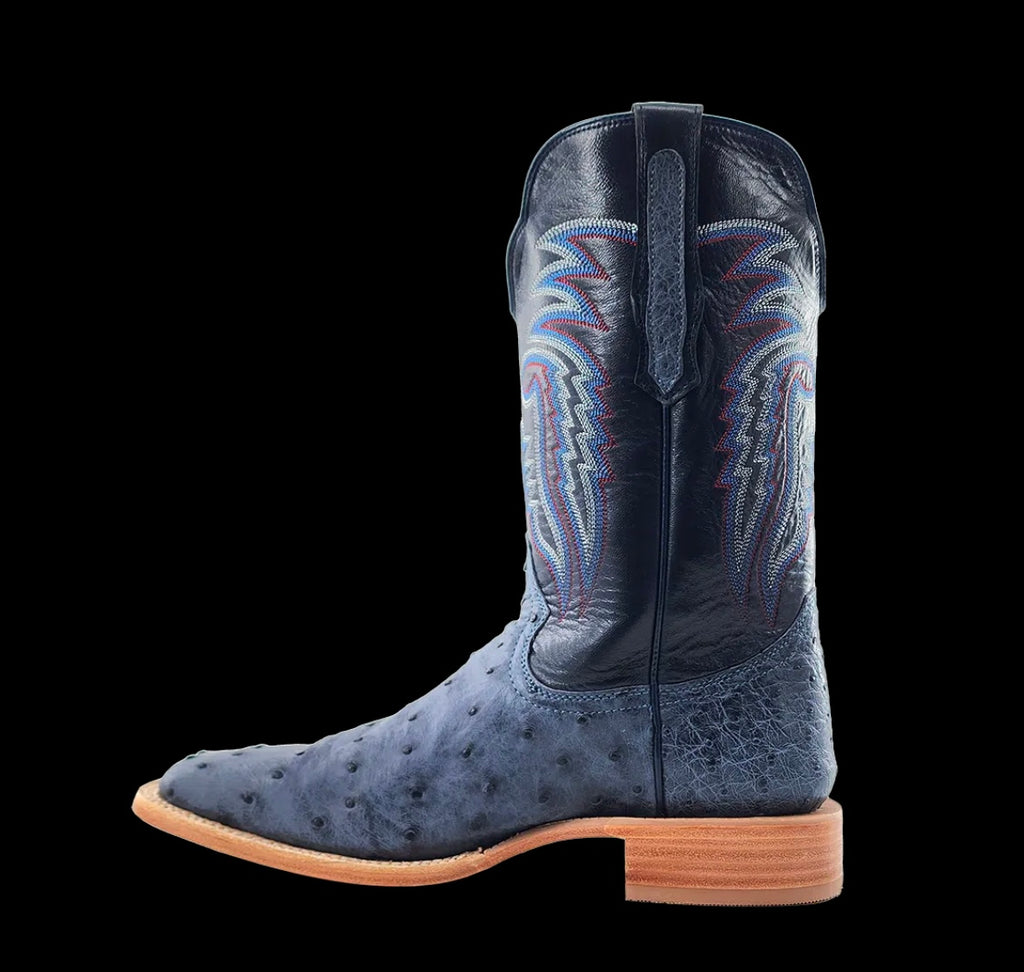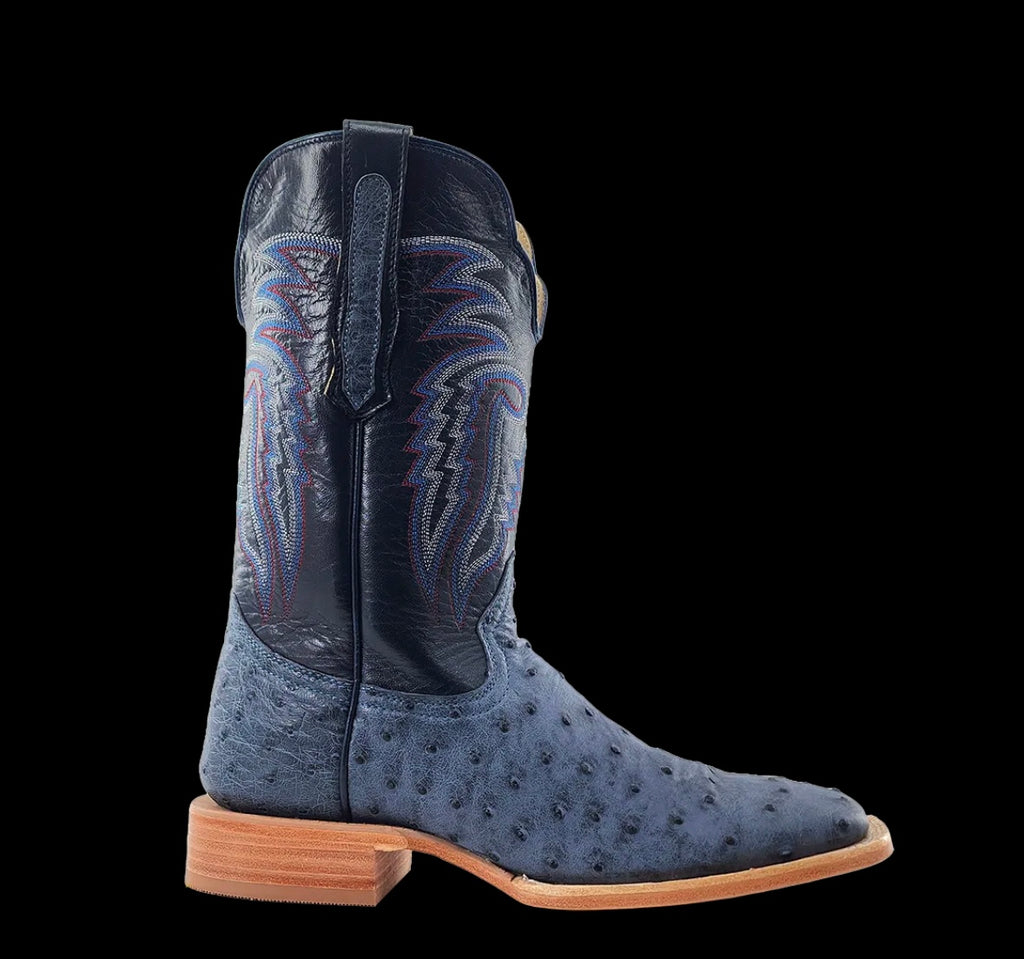R. Watson presents these American blue jean full quill ostrich and navy goat exotic western boots. These boots have a 10 row stitch pattern, R. Watson comfort system, all leather stacked heel, counters, solid steel shank, and 10 iron outsole. 11″ total in height.