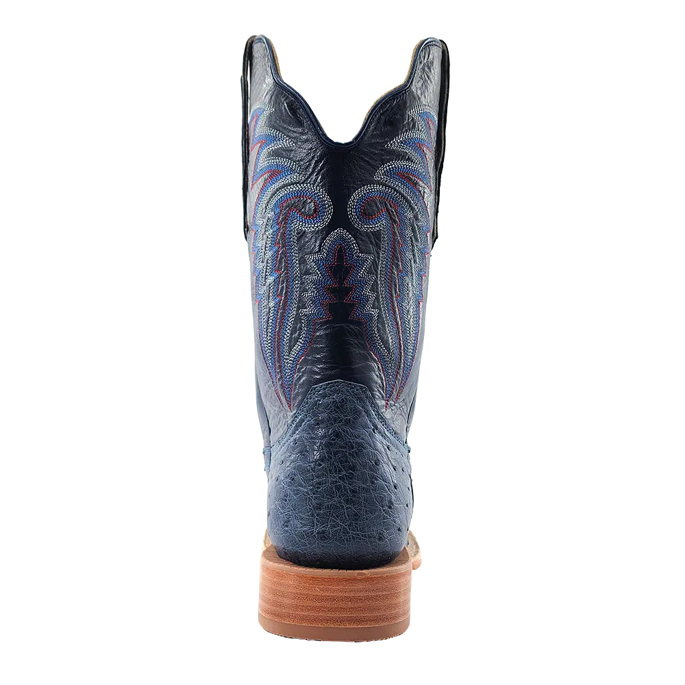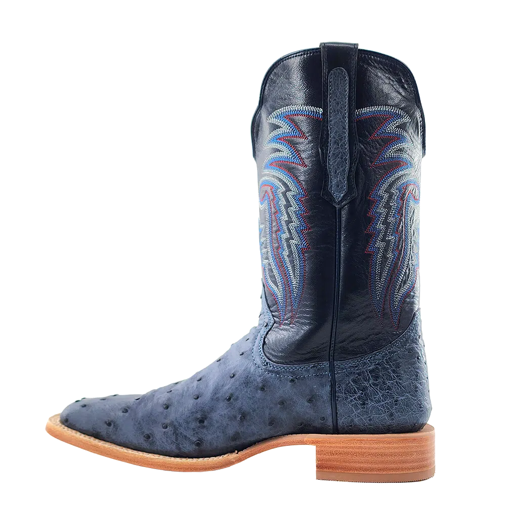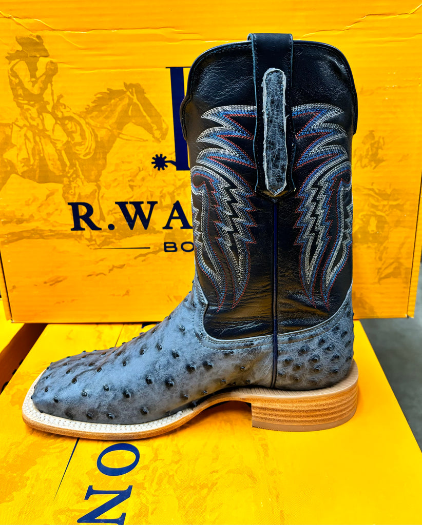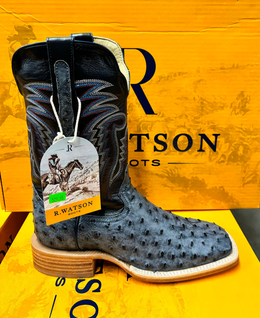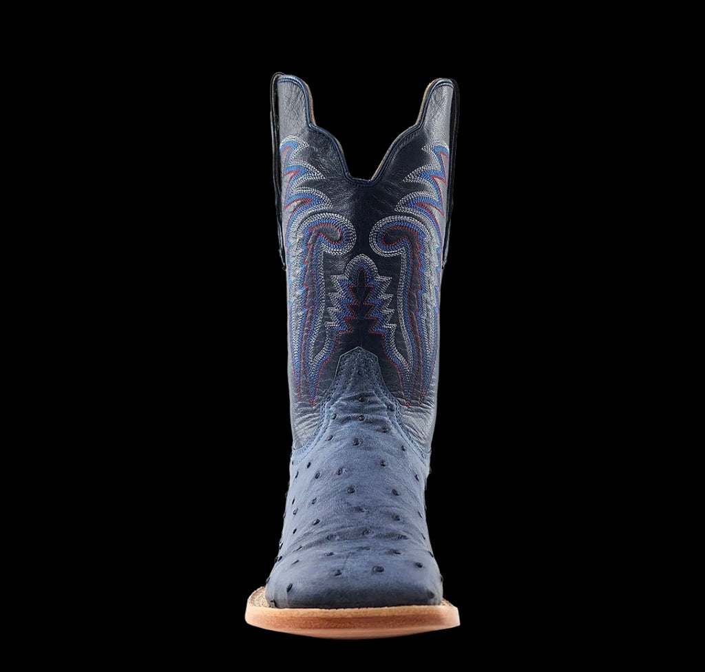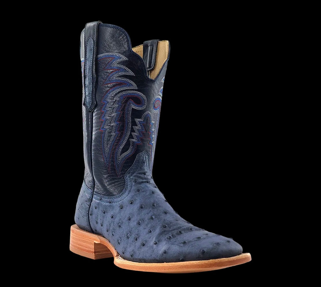 R. Watson presents these American blue jean full quill ostrich and navy goat exotic western boots. These boots have a 10 row stitch pattern, R. Watson comfort system, all leather stacked heel, counters, solid steel shank, and 10 iron outsole. 11″ total in height.