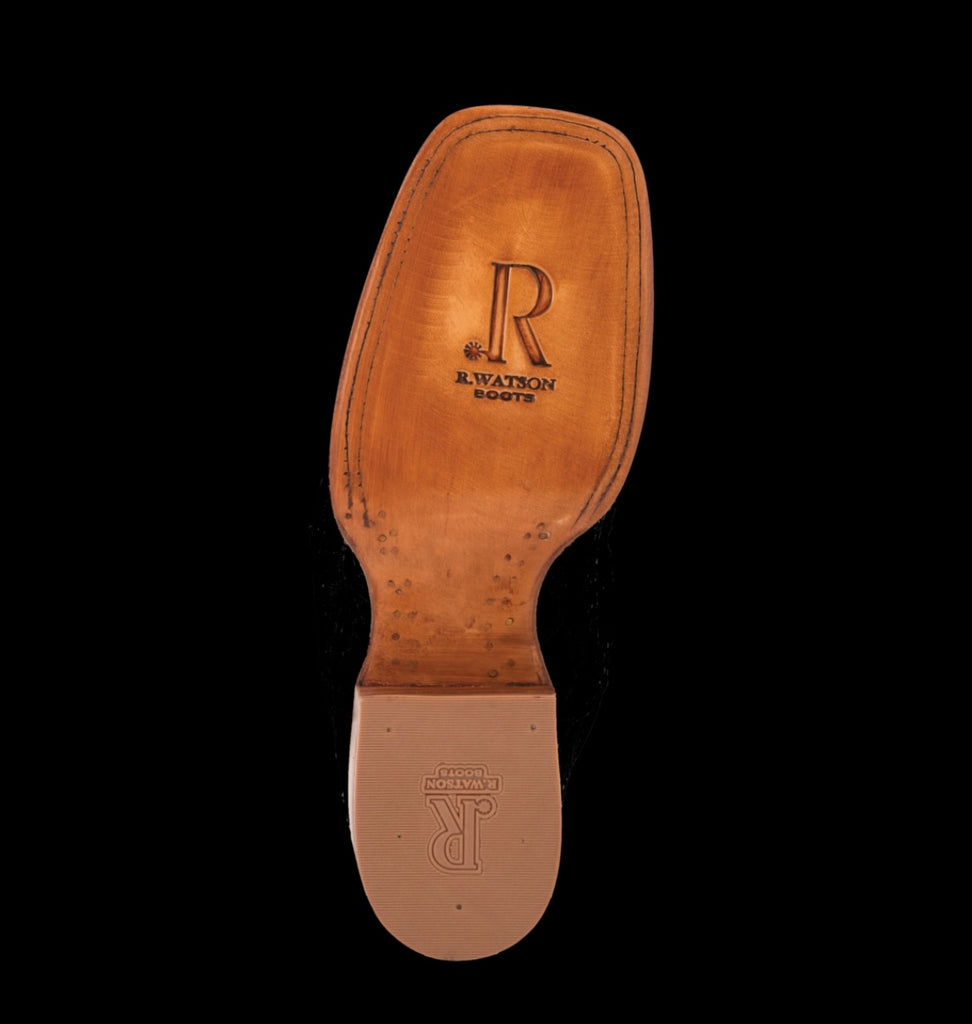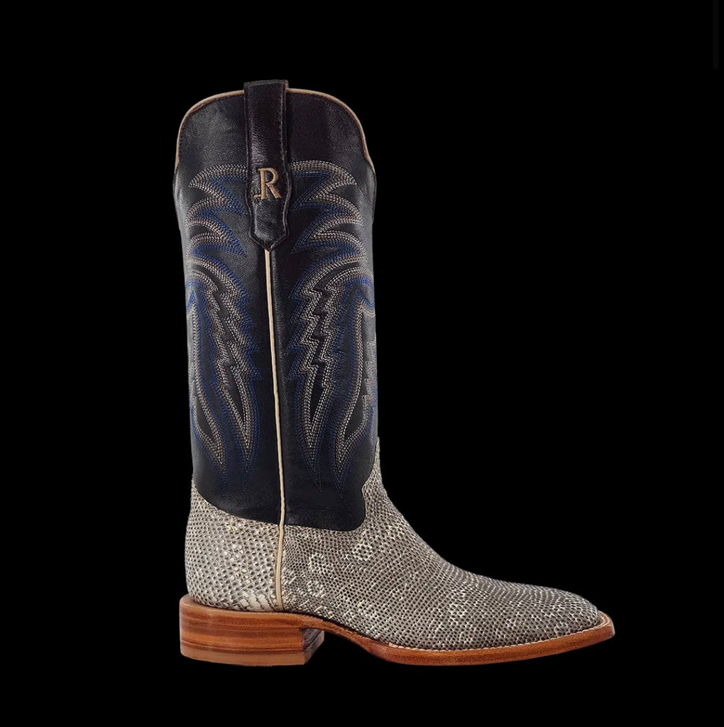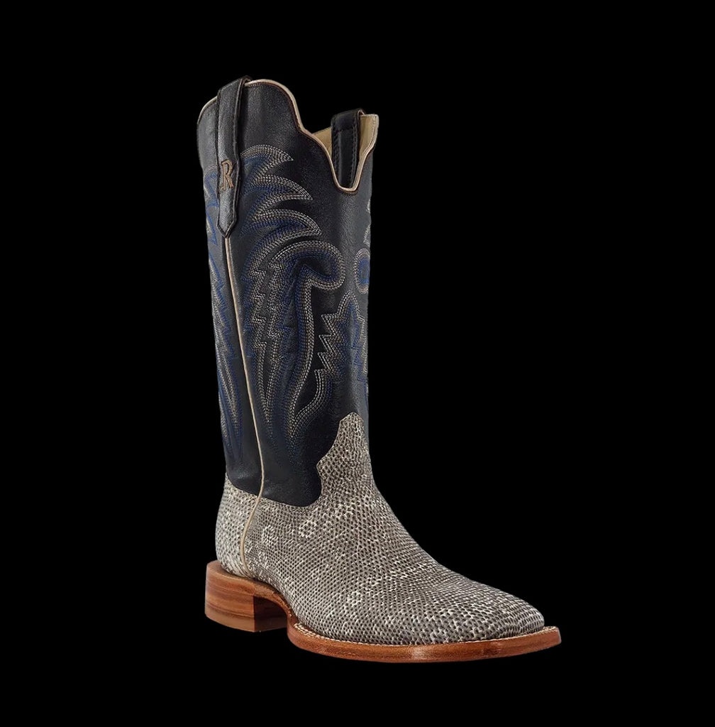 R. Watson presents these natural ring lizard and chocolate cow exotic western boots. These boots have a 10 row stitch pattern, R. Watson comfort system, all leather stacked heel, counters, solid steel shank, and 10 iron outsole. 13″ total in height.