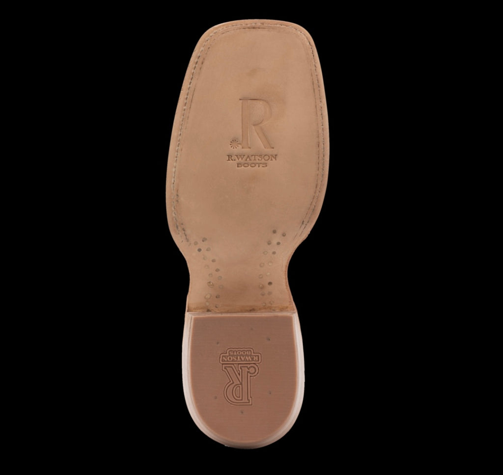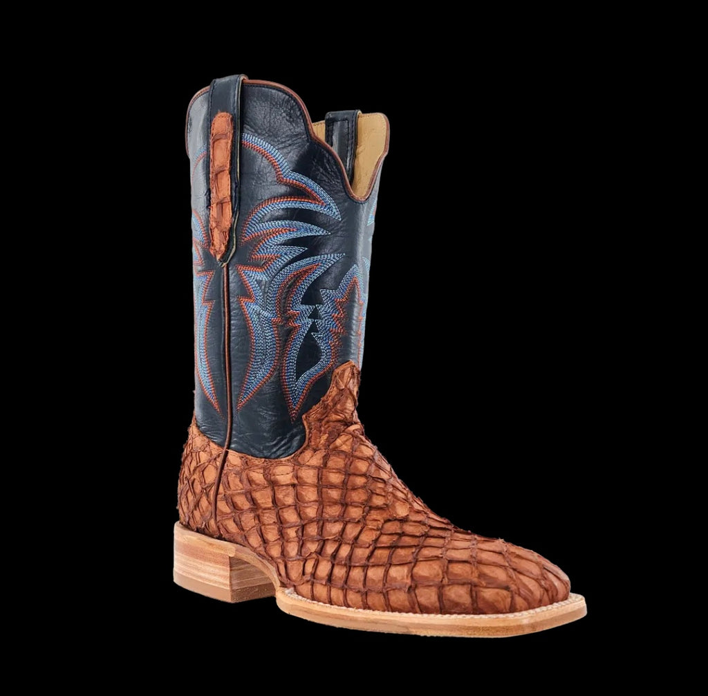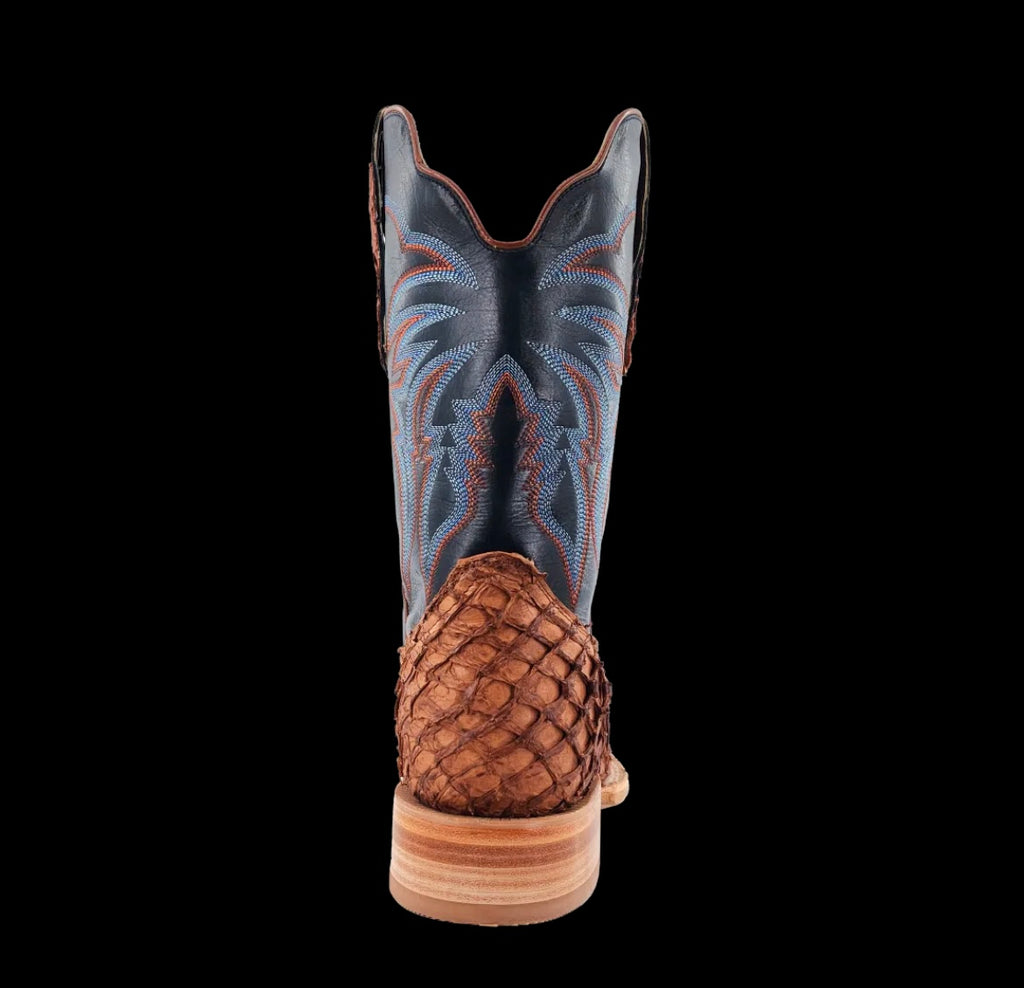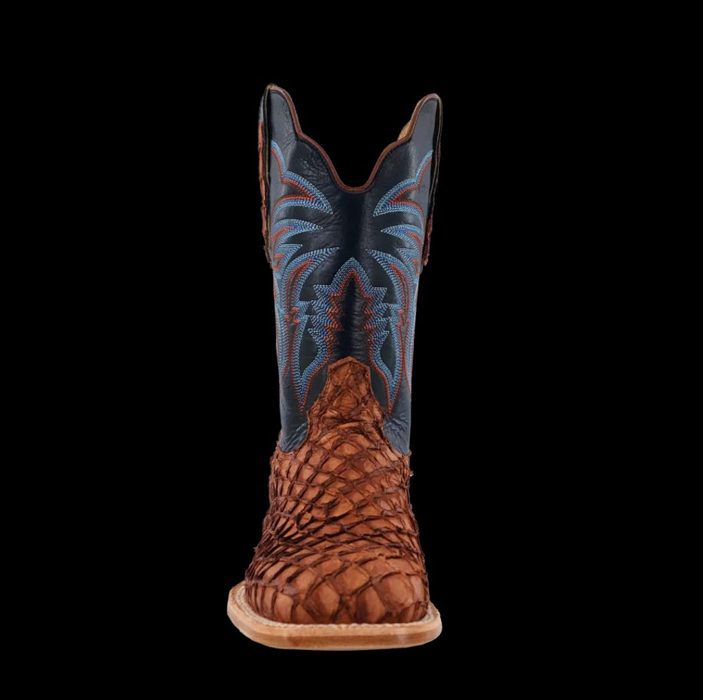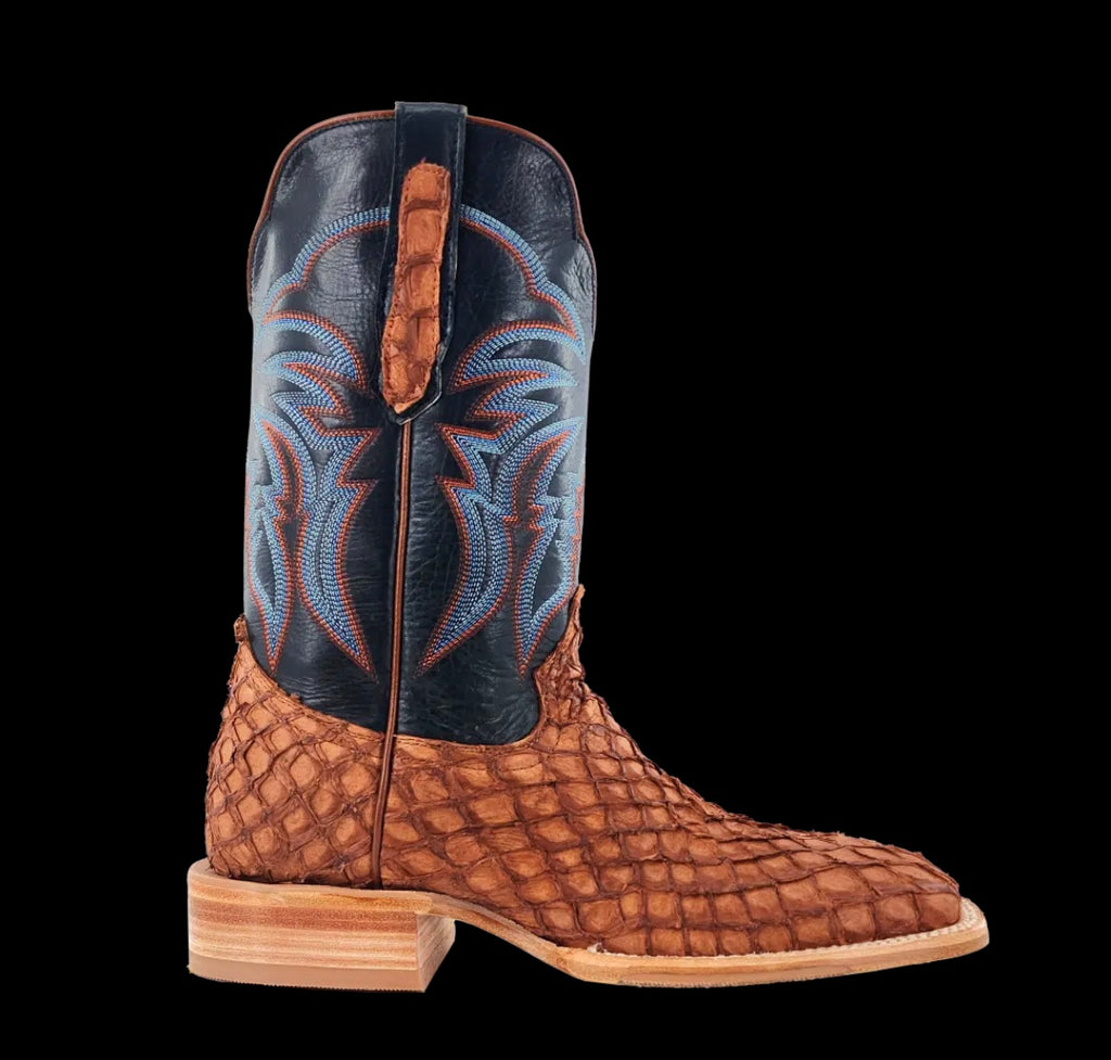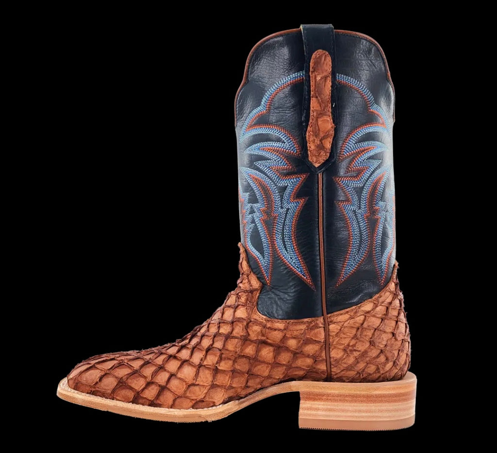 R. Watson presents these matte cognac pirarucu and deep pacific cowhide western boots. These boots have a 10 row stitch pattern, R. Watson comfort system, all leather stacked heel, counters, solid steel shank, and 10 iron outsole. 11″ total in height.