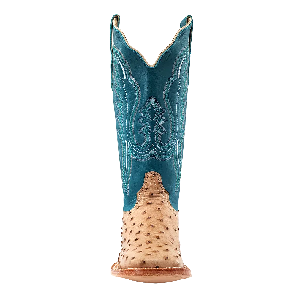 R. Watson presents these sand bruciato full quill ostrich and teal sinatra cowhide western boots. These boots have a 10 row stitch pattern, R. Watson comfort system, all leather stacked heel, counters, solid steel shank, and 10 iron outsole. 13″ total in height.