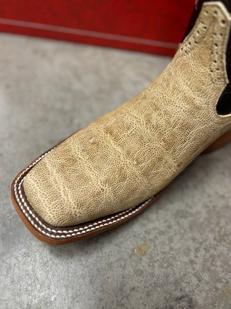 Elephant is tanned in pieces with each piece having it own distinct grain, some heavy and some smooth. It is a very popular leather and is fairly available due to the governments in south of Africa not wasting the meat or hides of those animals taken for population control. Elephant is scuff resistant for work and is nice for casual wear.  Since it is fairly dry, it should be regularly cleaned and conditioned.