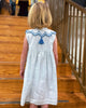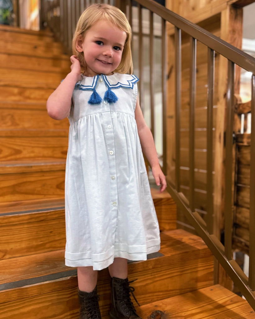 Sleeveless knee-length dress with embroidered collar, gathered waist, tassel details, and front button opening.