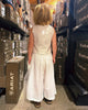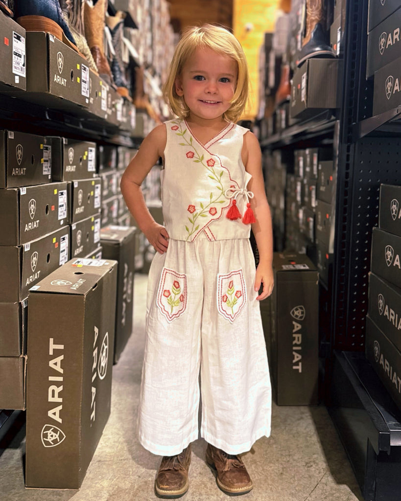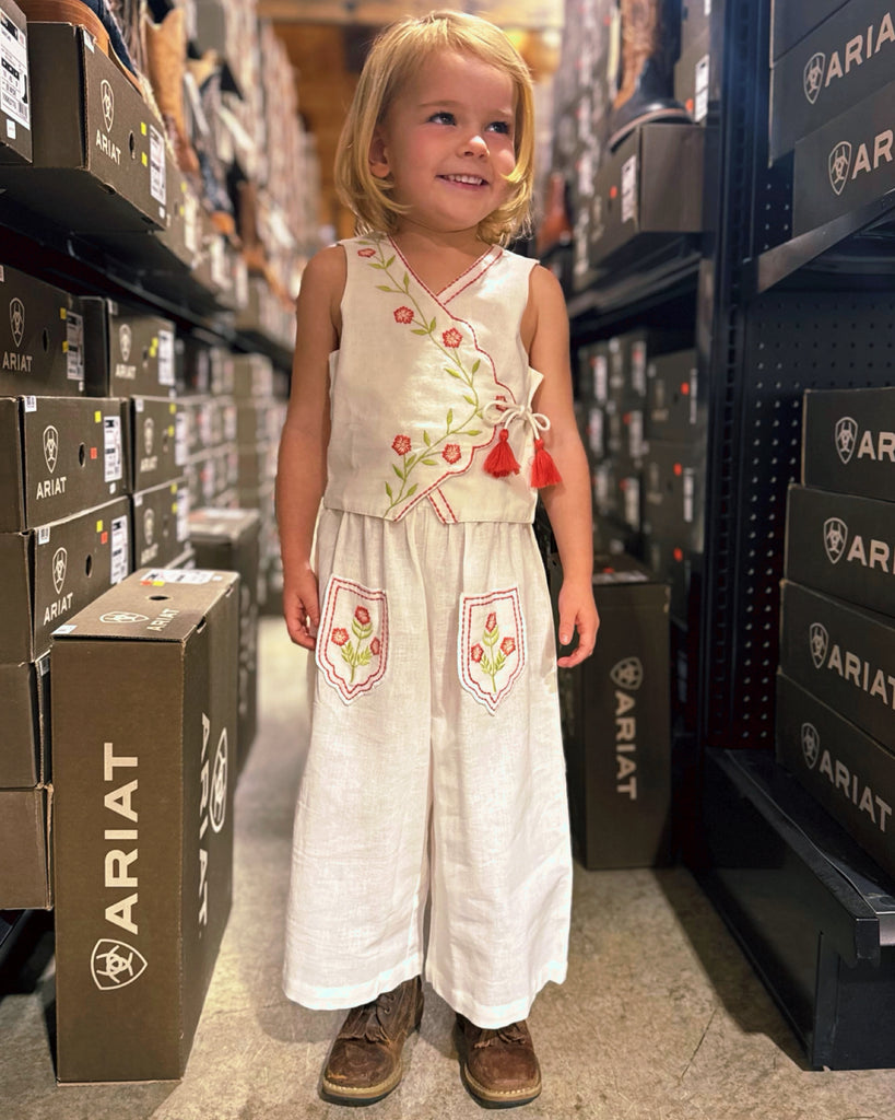 Straight wide leg pants featuring front patch pockets with embroidery, showcasing different stitch patterns inspired by the arches of Jaipur.