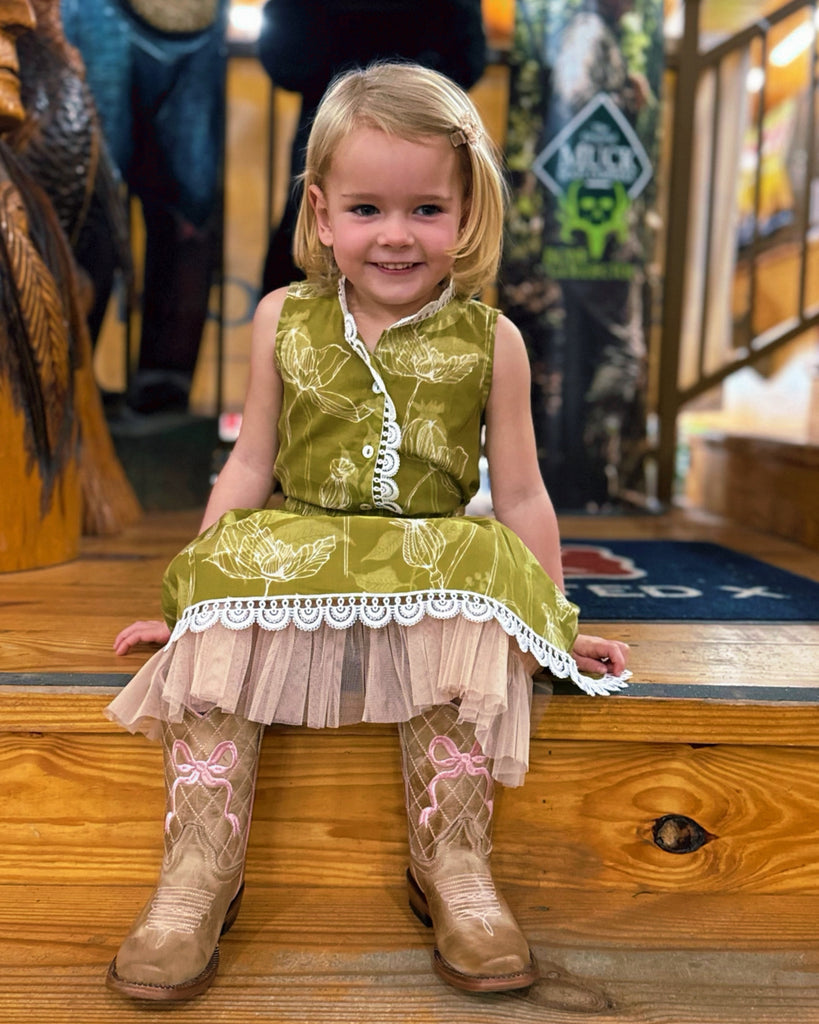 Details: Matching set in sleeveless top and elasticated skirt features lace, gathers and buttons.