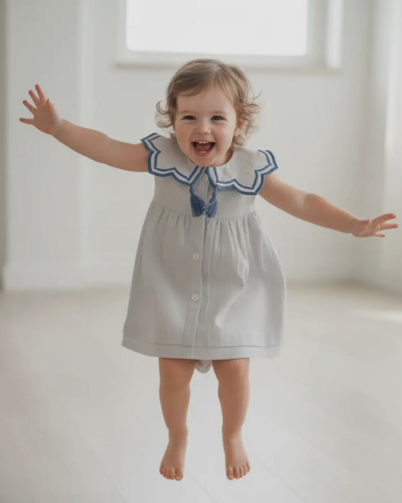 Sleeveless knee-length dress with embroidered collar, gathered waist, tassel details, and front button opening.
