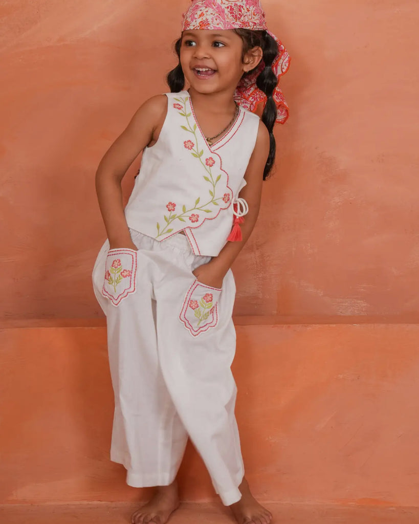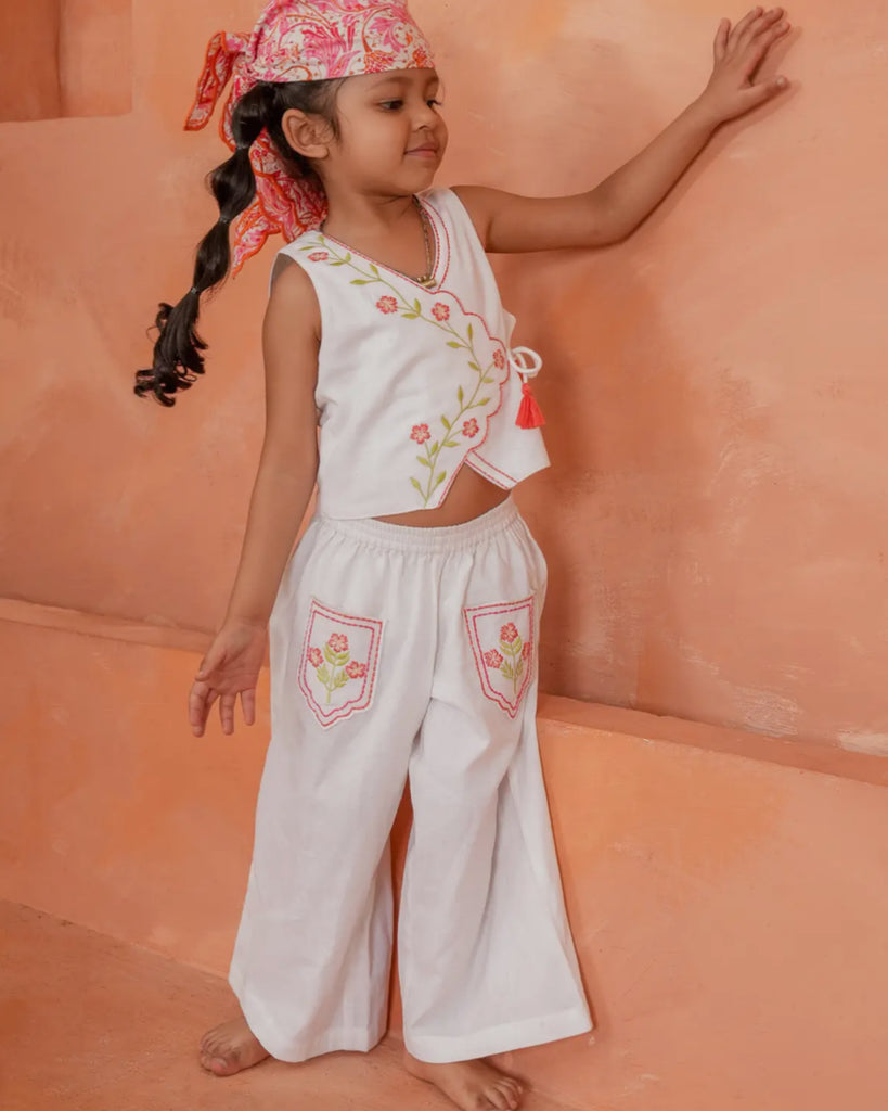 Straight wide leg pants featuring front patch pockets with embroidery, showcasing different stitch patterns inspired by the arches of Jaipur.