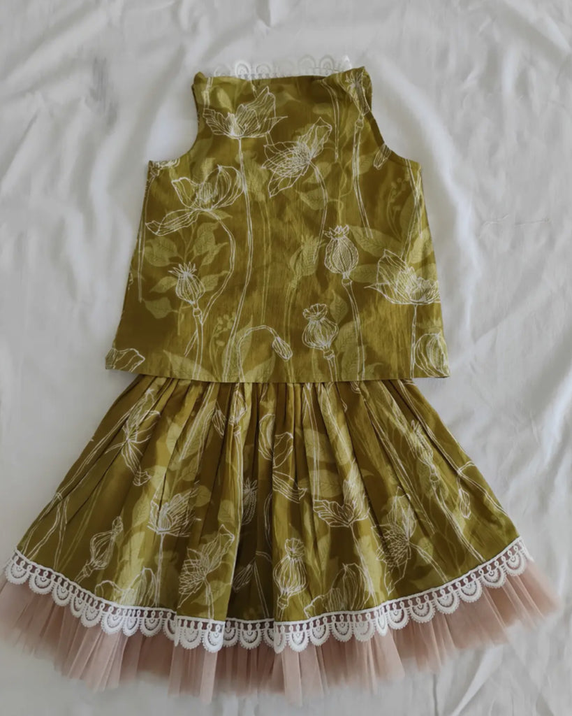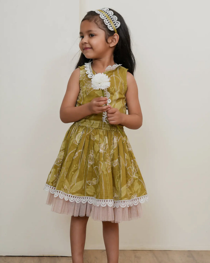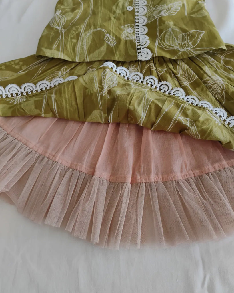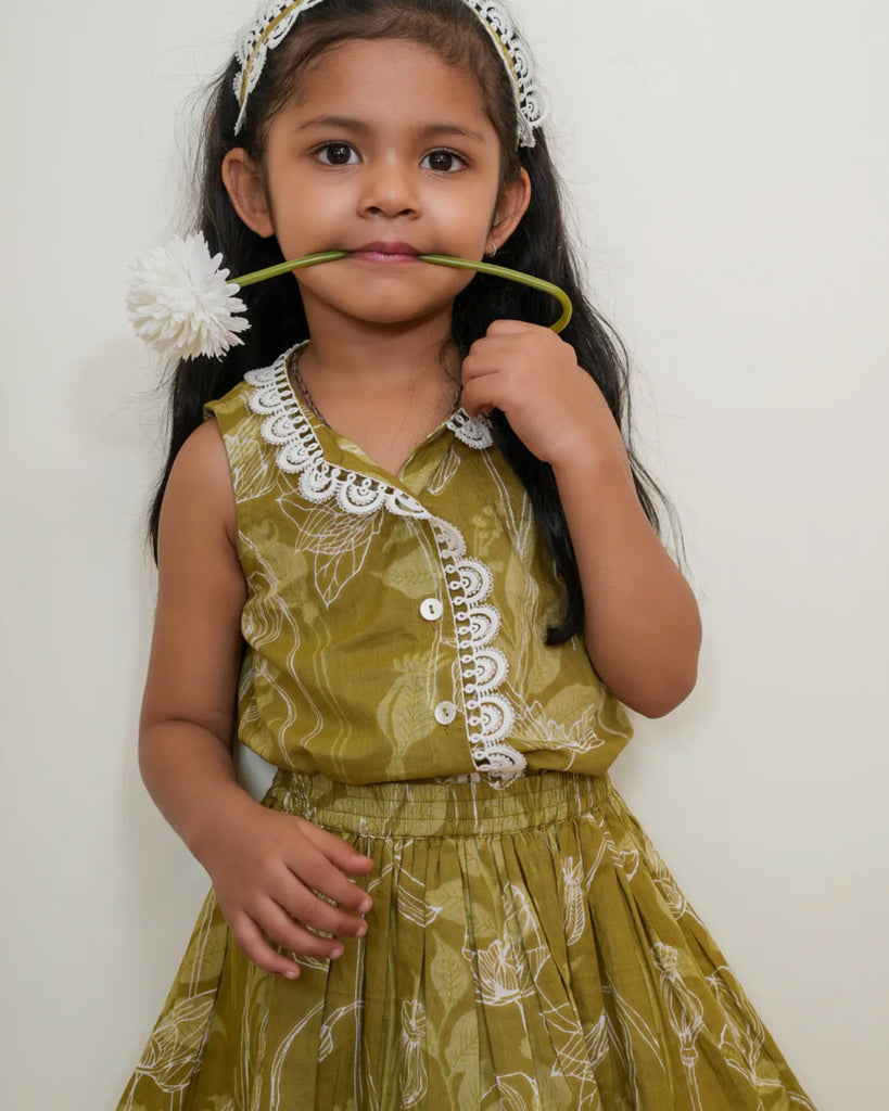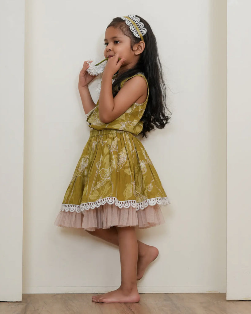 Details: Matching set in sleeveless top and elasticated skirt features lace, gathers and buttons.