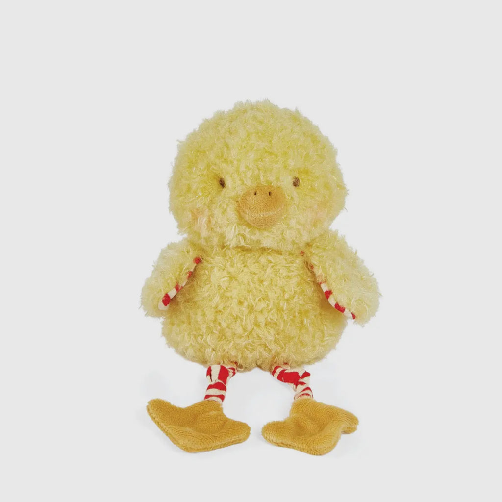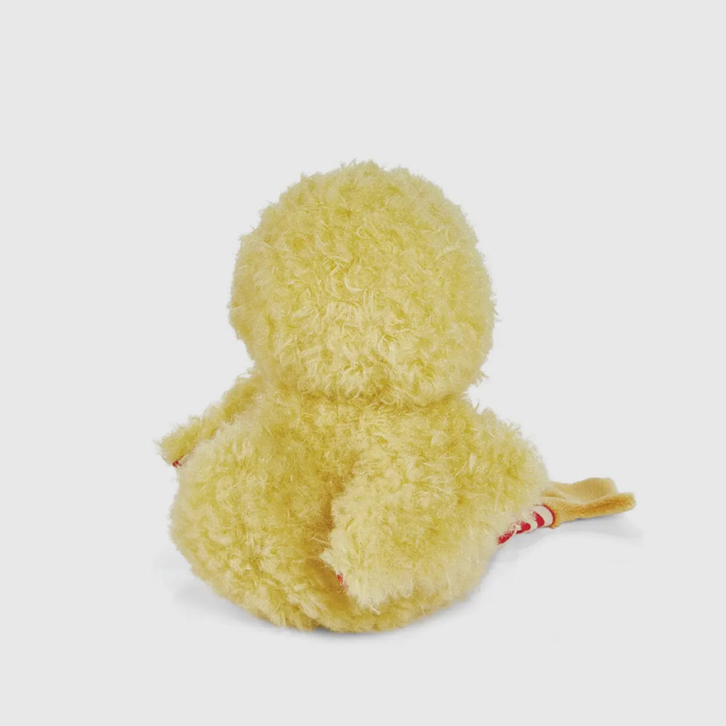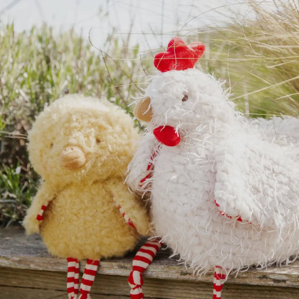 This darling chicken stuffed animal has a shaggy yellow fur body with striped, red and cream knit legs that dangle and cute orange feet and beak for an extra pop of fun and color.