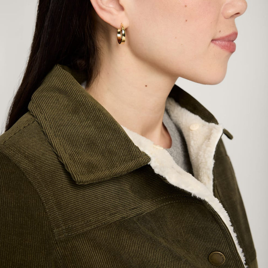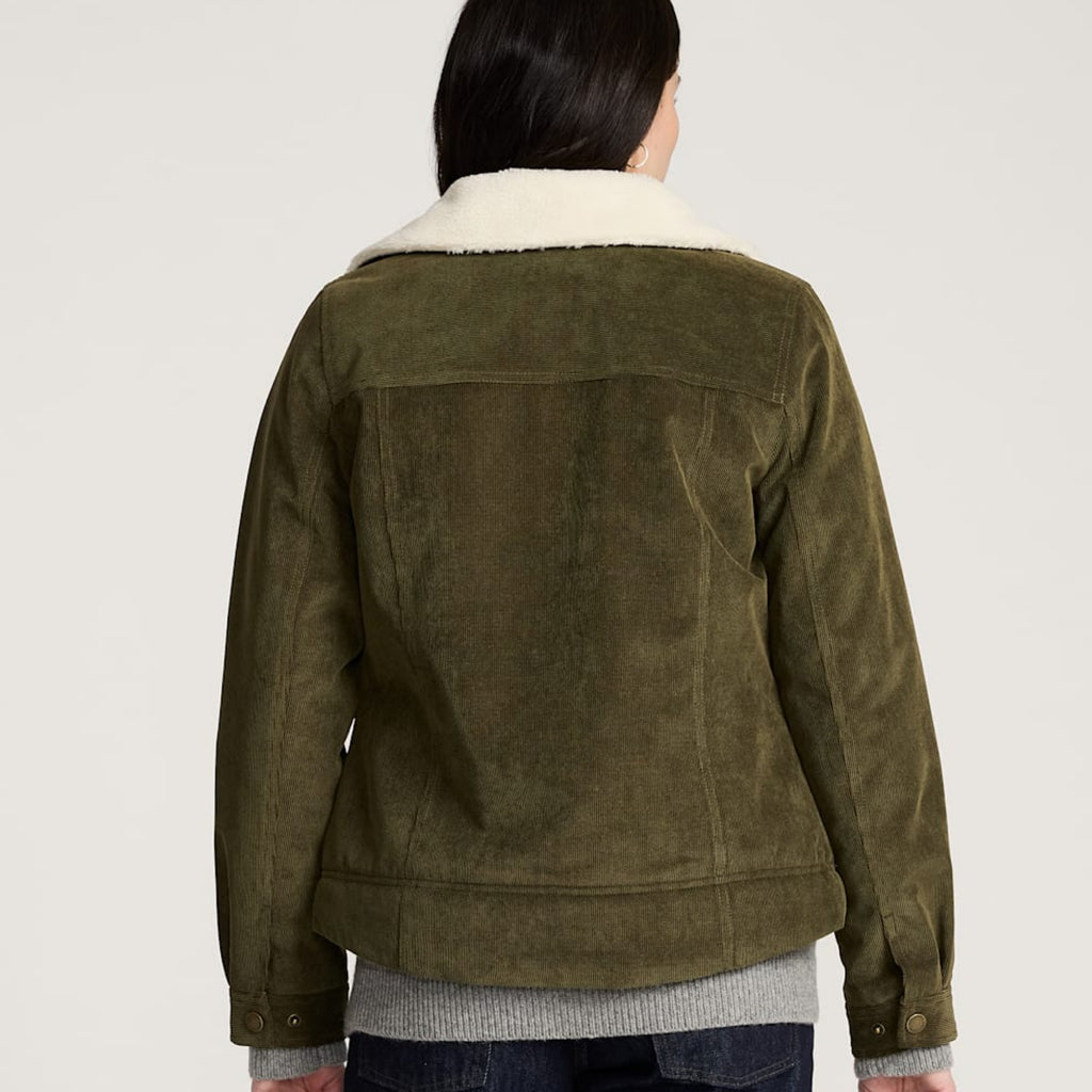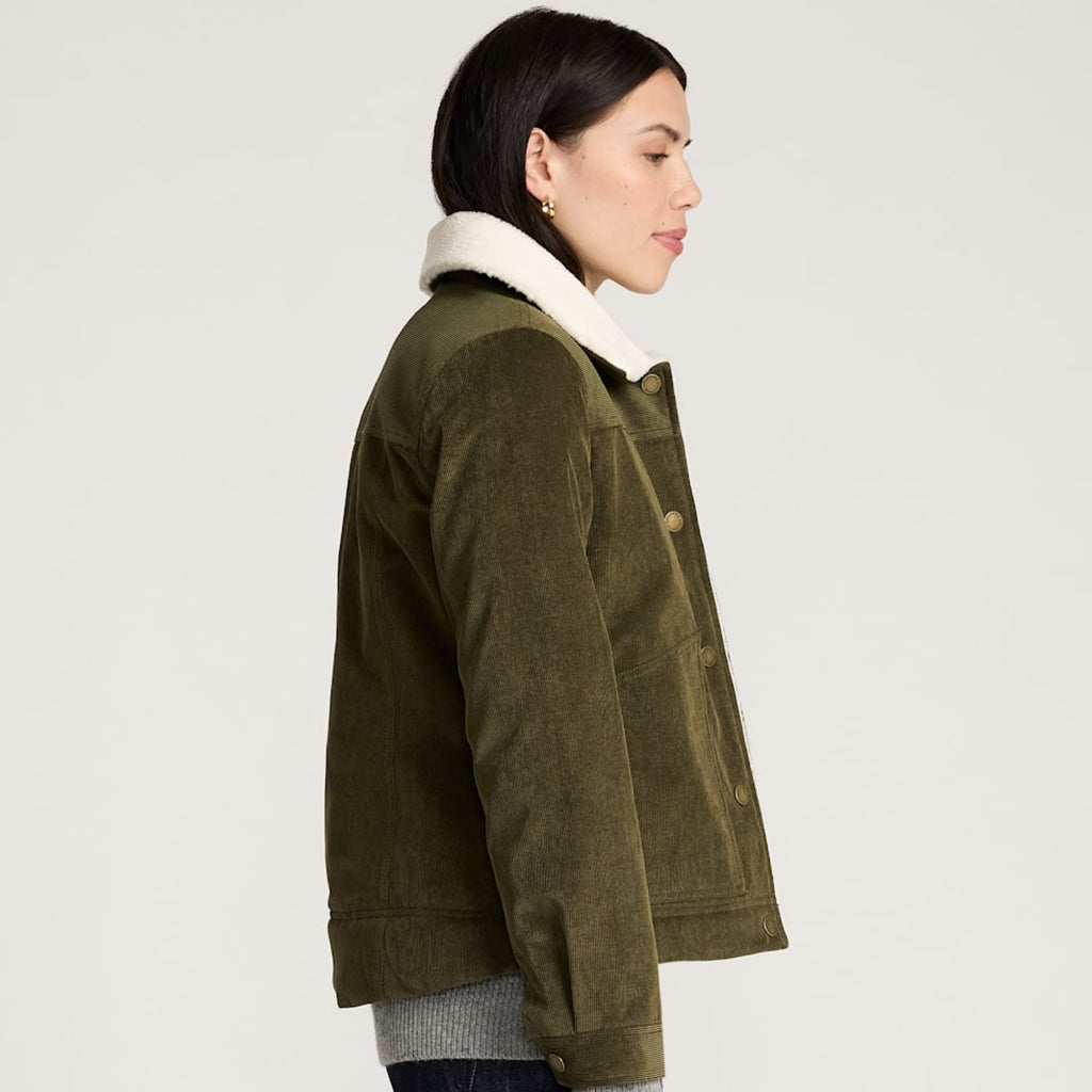 This snap-front trucker-style jacket is made from 16-wale corduroy with a TPU water-resistant membrane, and body lined with fleece, making it the perfect cozy layer for chilly days. Features a button-off Sherpa collar, adjustable snap cuffs, and a hi-lo hem. One chest pocket, two lower patch pockets with side welt openings, and inside secure pockets.