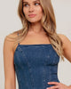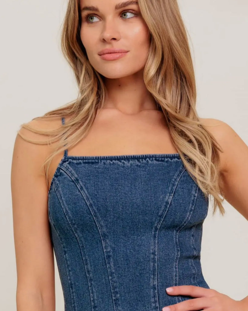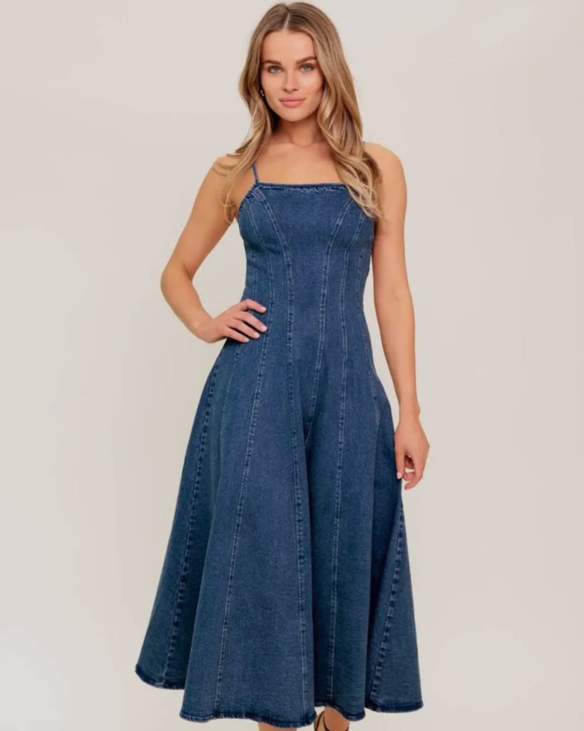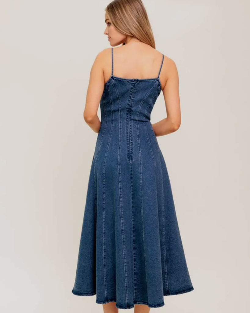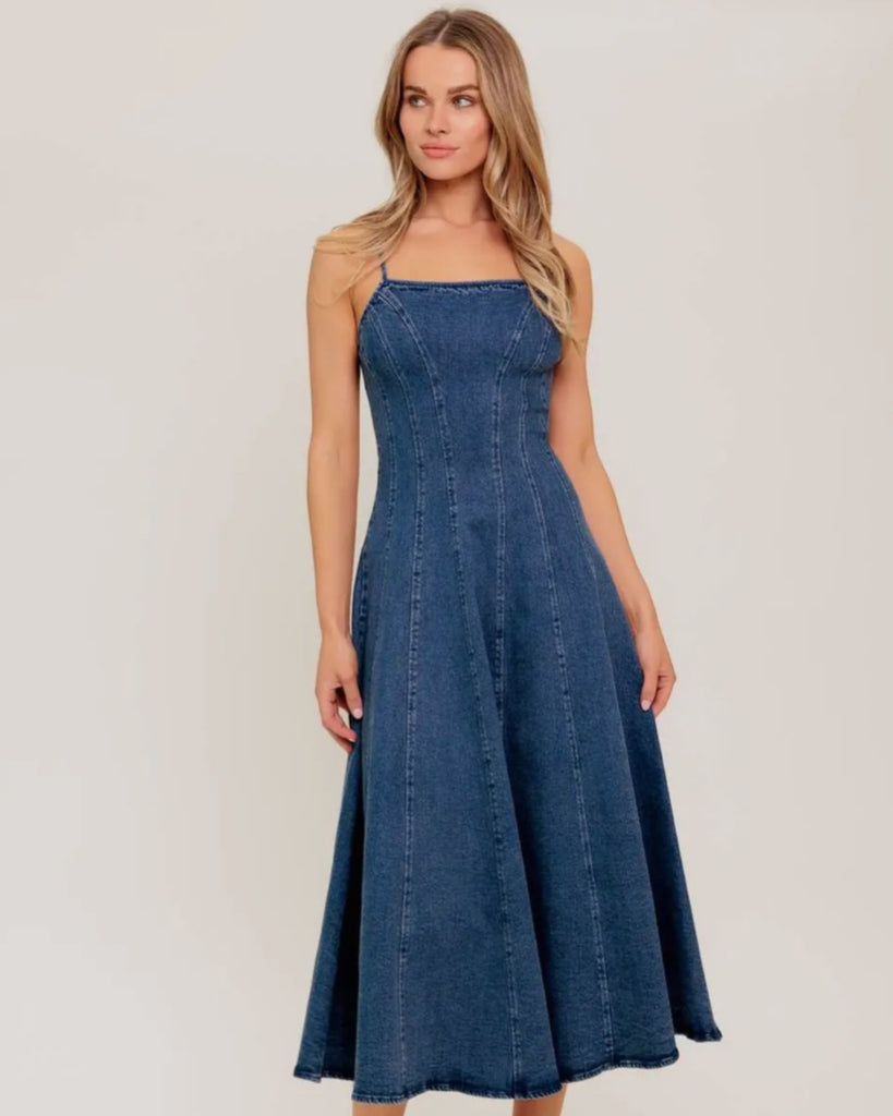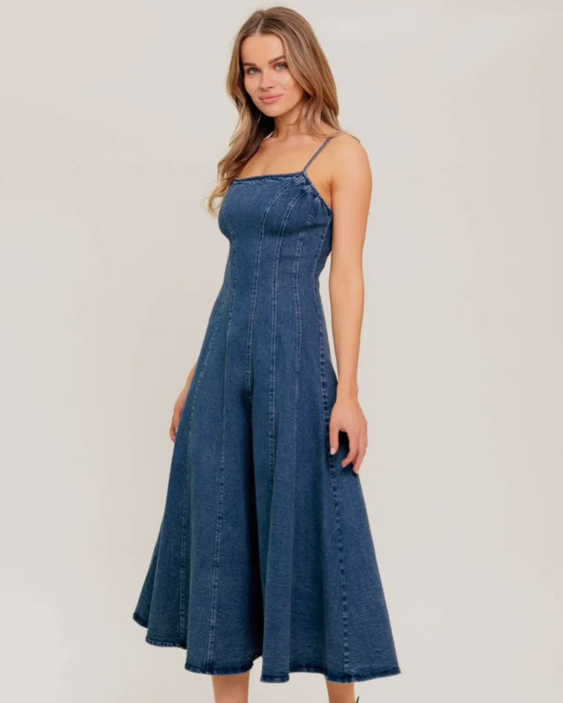 Washed denim midi dress featuring a straight neckline, full skirt & back zipper.