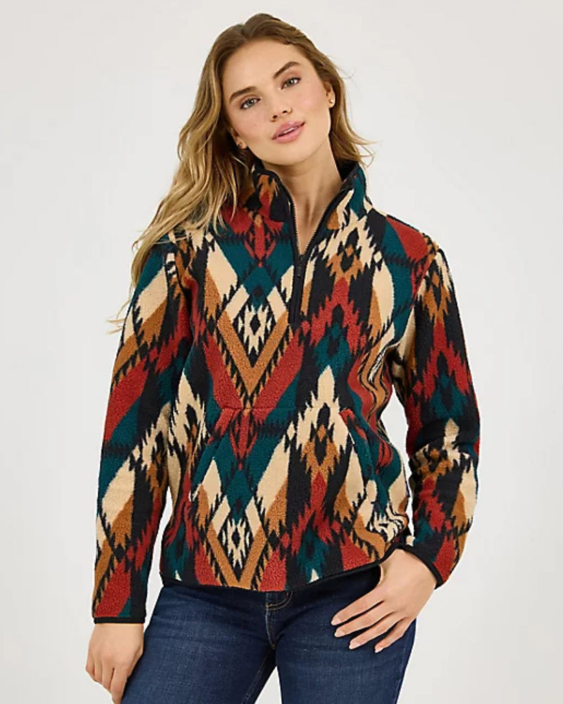 Full of southwestern spirit and cozy vibes, this Wrangler® women's quarter-zip pullover is a versatile staple you'll be reaching for all season long. Its sherpa fabric offers plenty of warmth for an easy layering piece you can toss on over your favorite graphic t-shirts. The classic print adds a striking look and authentic style perfect for pairing with Wrangler jeans.