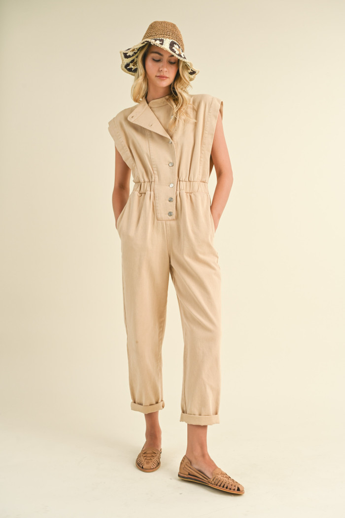 This one-and-done denim jumpsuit makes looking fabulous so easy! Light denim creates this jumpsuit with a button down placket panel and sleeveless bodice. Relaxed bodice features a fitted elastic waist. Tapered pant legs have pockets.