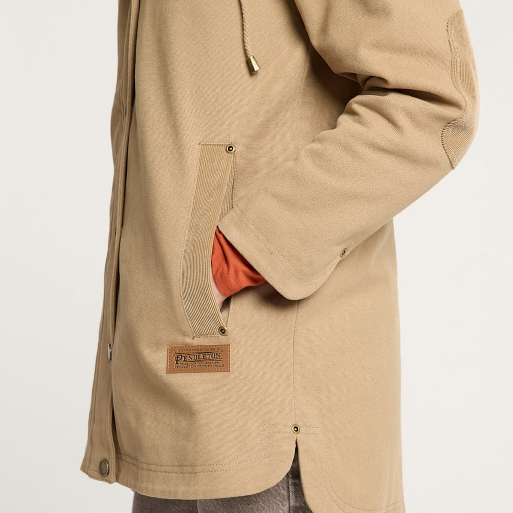 Cotton canvas parka designed for warmth, comfort, and classic Pendleton style. Features a classic fit, with a zip front with snap placket, light fill for cold days, corduroy trim on the hood, elbow patches and pocket welts. Upper back and hood are lined in cozy Harding-patterned fleece for signature heritage appeal, with interior security pockets, a drawcord hood, high-low hem, and authentic logo patch.