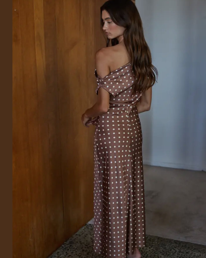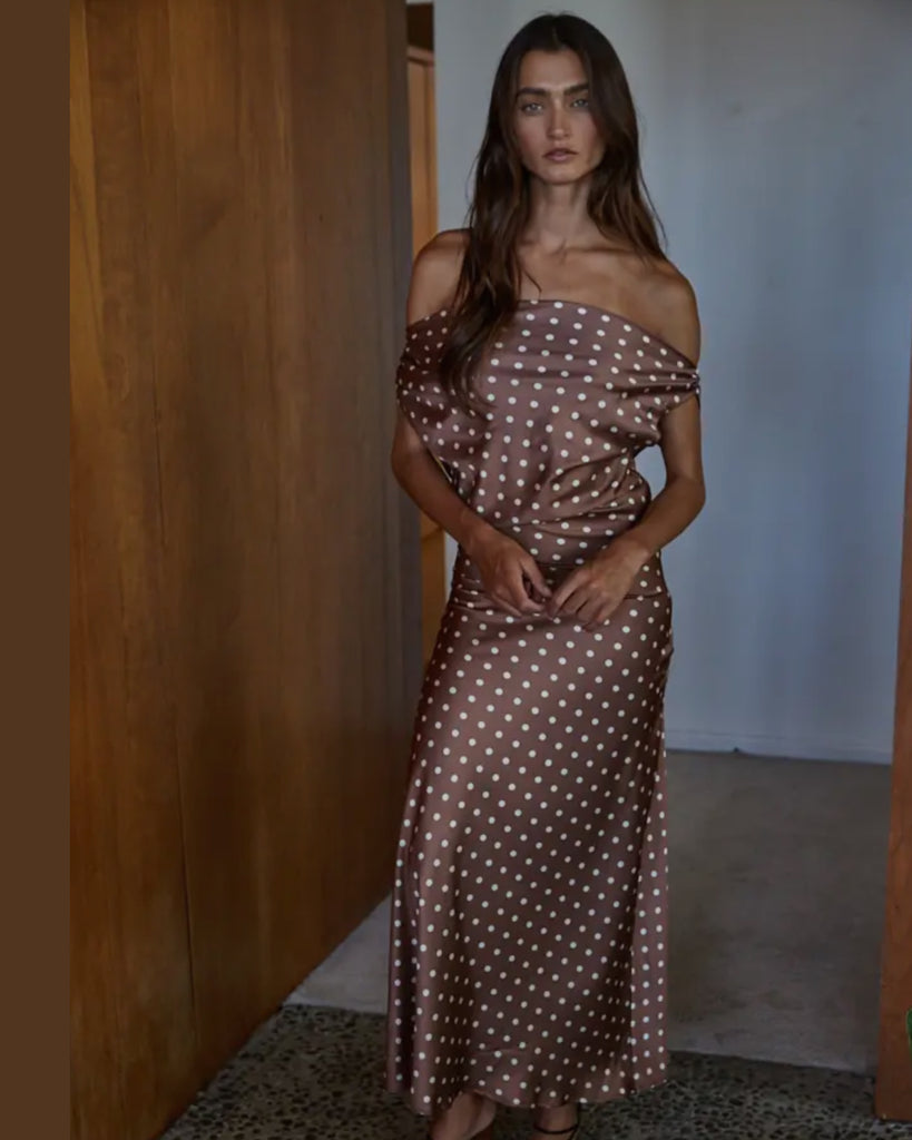 Imported woven polyester satin polka dot cowl neck sleeveless maxi dress.  Rayon lining.  Side zipper.