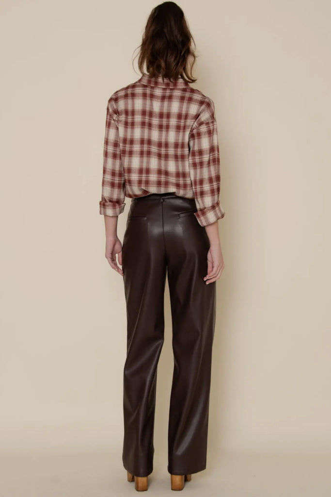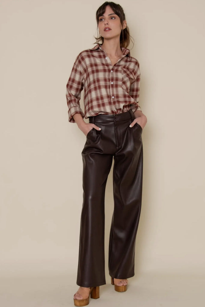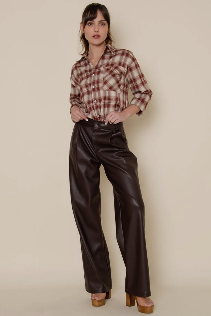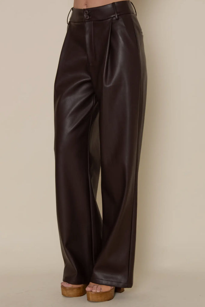 Sleek, structured, and effortlessly chic — our Single Pleat Vegan Leather Pants are a modern wardrobe essential with an elevated twist. Crafted from premium faux leather, these pants feature a single front pleat that adds a tailored touch to their clean, straight-leg silhouette. The high-waisted design flatters the figure while offering comfort and versatility for day-to-night wear. With a smooth finish and subtle sheen, they pair perfectly with minimalist tops, blazers, or cozy knits for a polished yet edgy look. Designed for elevated basics, modern street style, and contemporary boutique collections, these pants deliver luxury texture and timeless sophistication — the perfect foundation for chic seasonal styling.