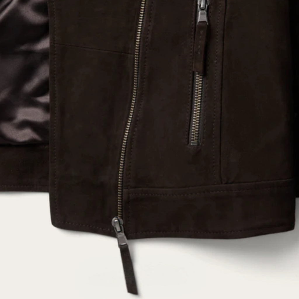 Traditionally used on buckskin garments to help shed rain, fringe is western style at its best—a functional detail that just happens to look fantastic. The Suede Fringe Motorcycle Jacket is crafted from high-quality suede leather and cut in a bold, statement-making silhouette. It features an oversized notch collar, asymmetrical front zip closure, and a wide waistband, with angled front zip pockets and zip closures at the back of the sleeves. Cascading fringe along the back yoke and down the sleeves add movement and unmistakable attitude.