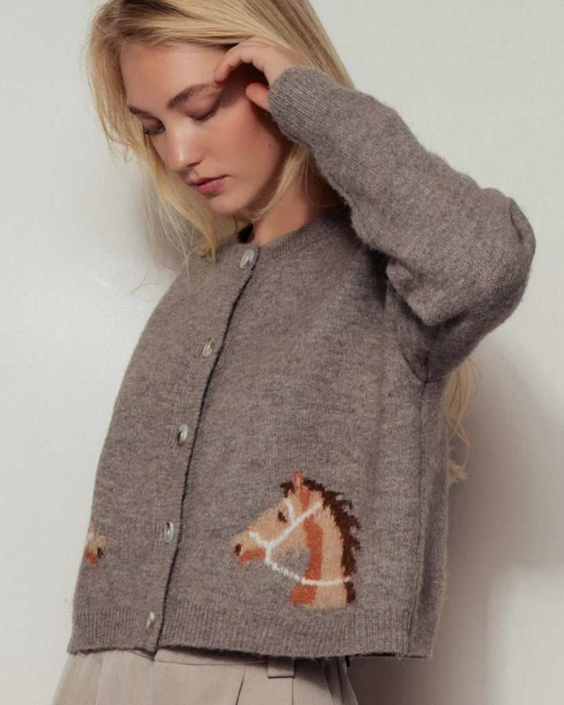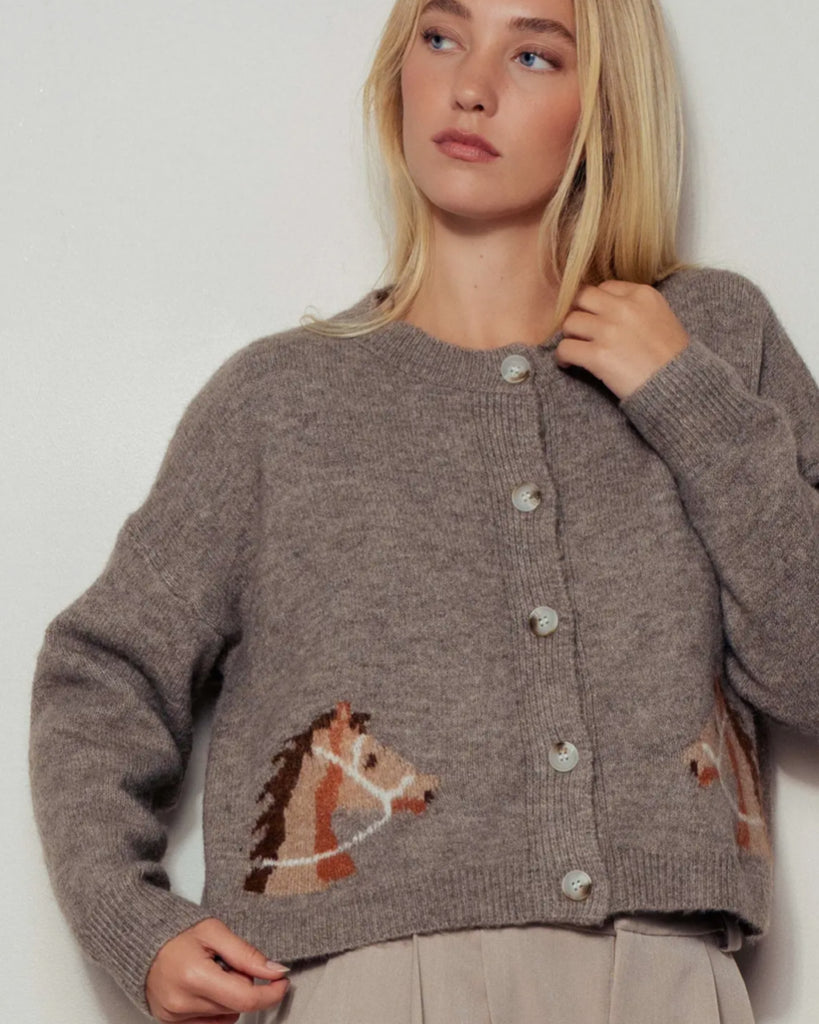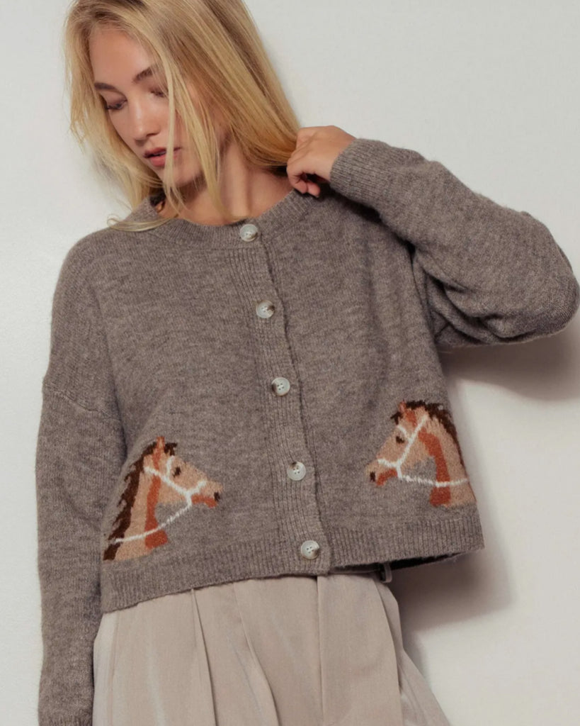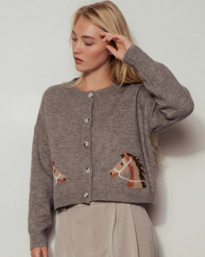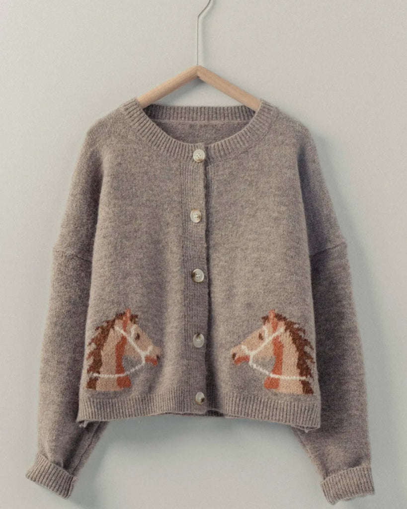 Make a statement in this charming cardigan featuring a playful horse and classic ribbed trim detailing.