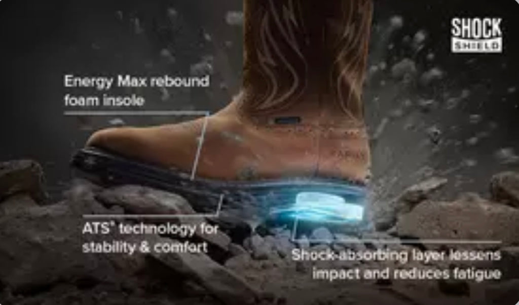 • Shock Shield® technology diffuses heel impact while absorbing shock and helping minimize fatigue