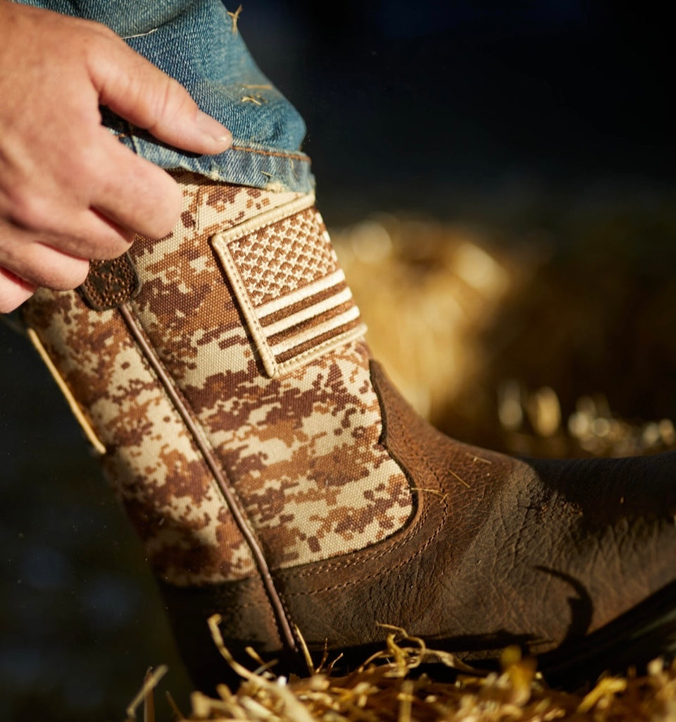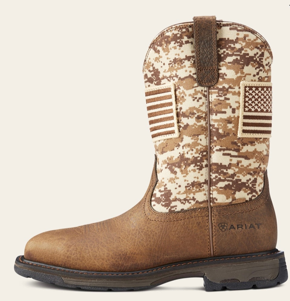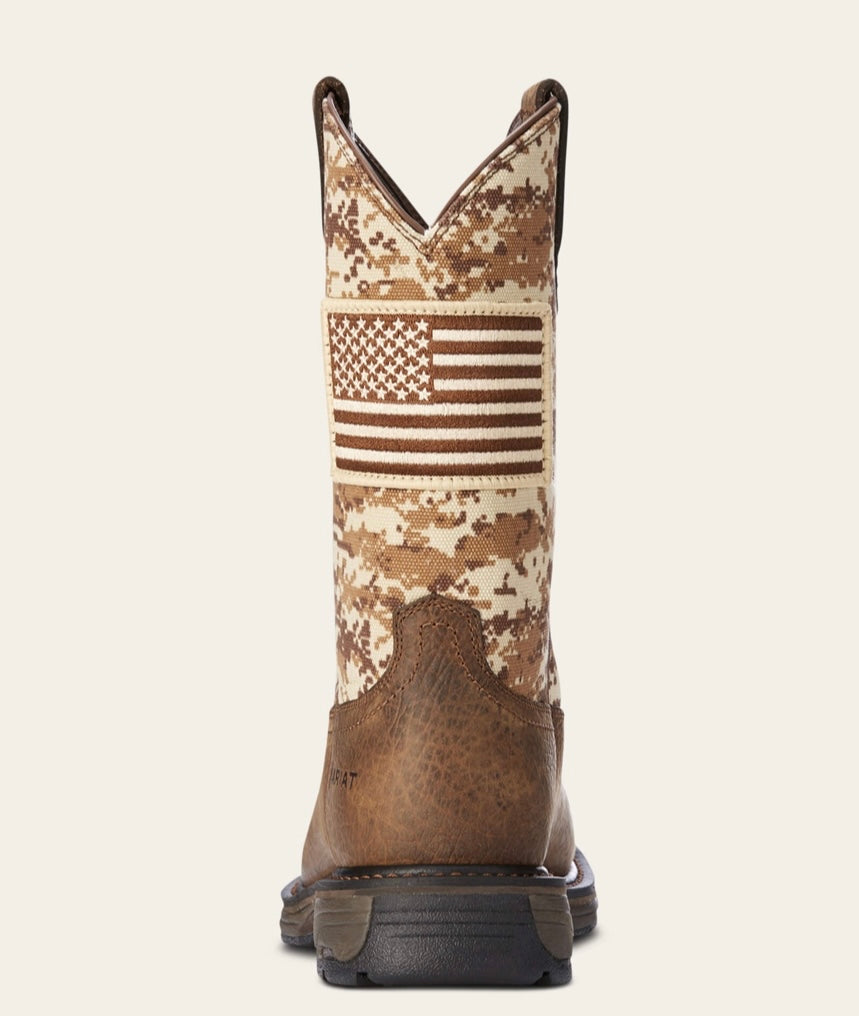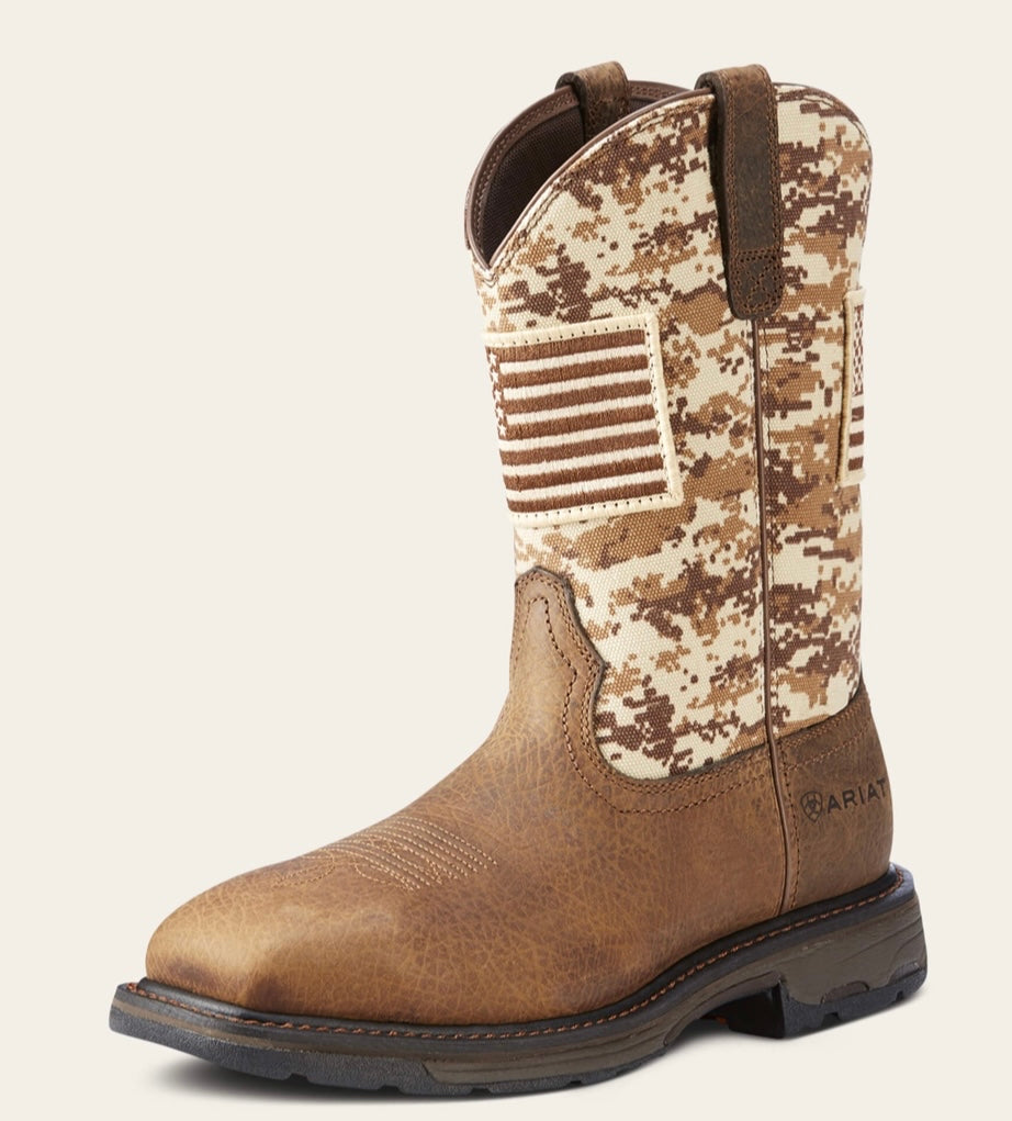 Show pride on the job with work boots styled with an American flag and camo pattern. The WorkHog® Patriot's extra-wide stability shank helps keep you supported on the job. These performance work boots are engineered to provide all-around comfort and reduced foot fatigue.