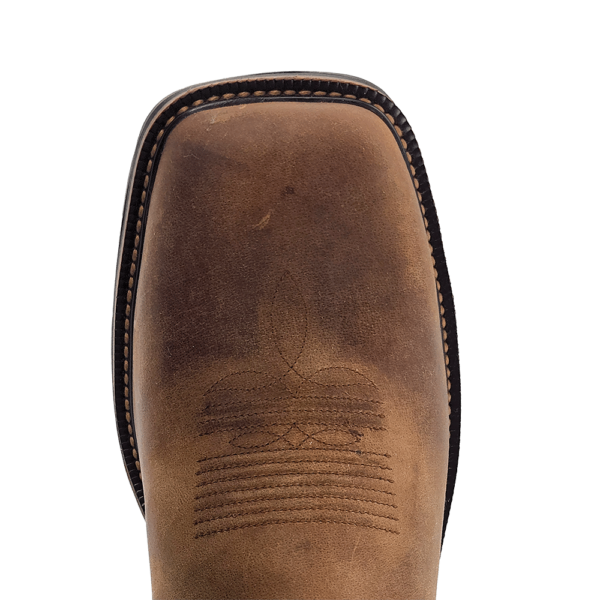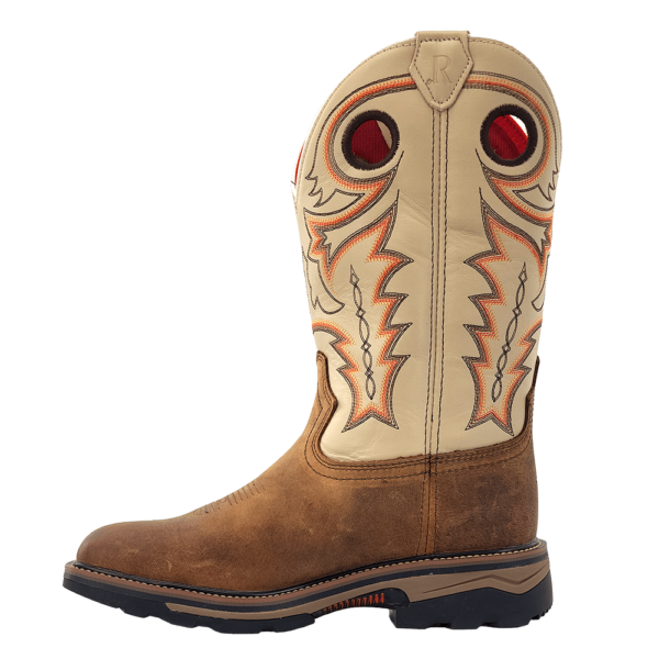 R. Watson presents these buffalo and cowhide wide square steel toe work boots. These work boots have a 10 row stitch pattern, removable orthotic insole, EVA midsole, medium duty rubber outsole. They are EH, slip and oil resistant. 12″ total in height.