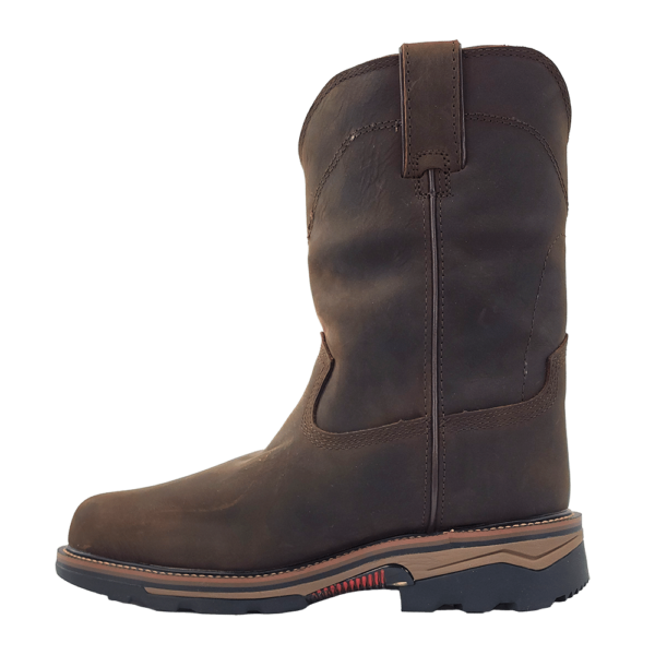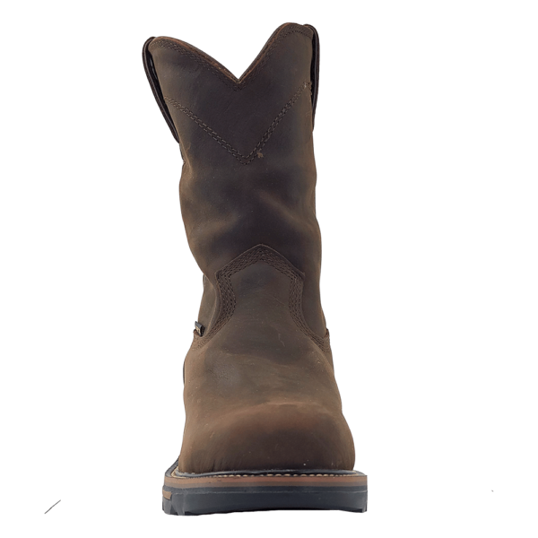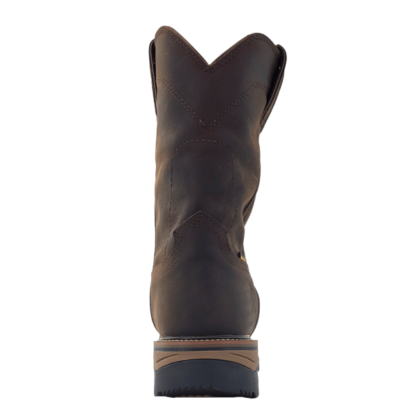 R. Watson presents these cowhide wide round composite toe work boots. These work boots have a 10 row stitch pattern, removable orthotic insole, EVA midsole, Vibram unit sole. They are EH, slip and oil resistant. 10″ total in height.