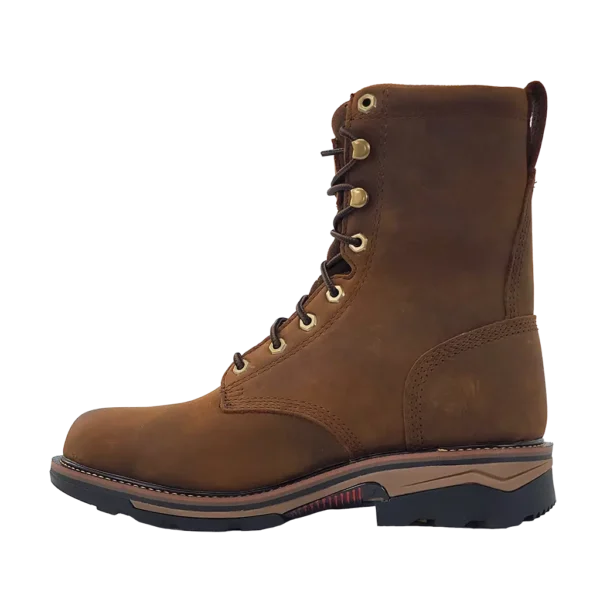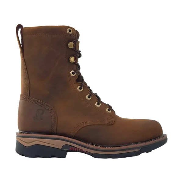 R. Watson presents these cowhide lace up round toe work boots. These work boots have a removable orthotic insole, EVA midsole, and a block heel. They are EH, slip and oil resistant. 8″ total in height.