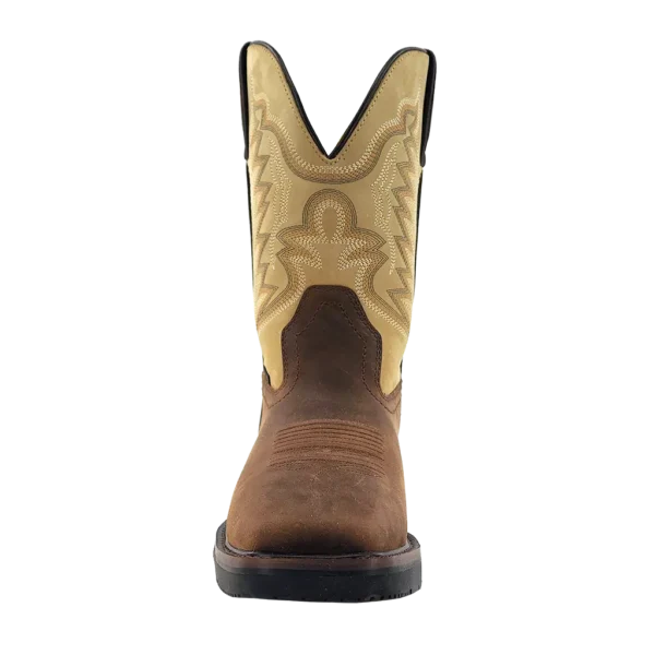 R. Watson presents these cowhide wide square steel toe work boots. These work boots have a 10 row stitch pattern, removable RW memory insole, molded EVA midsole, rubber outsole. They are EH, slip and oil resistant. 11″ total in height.