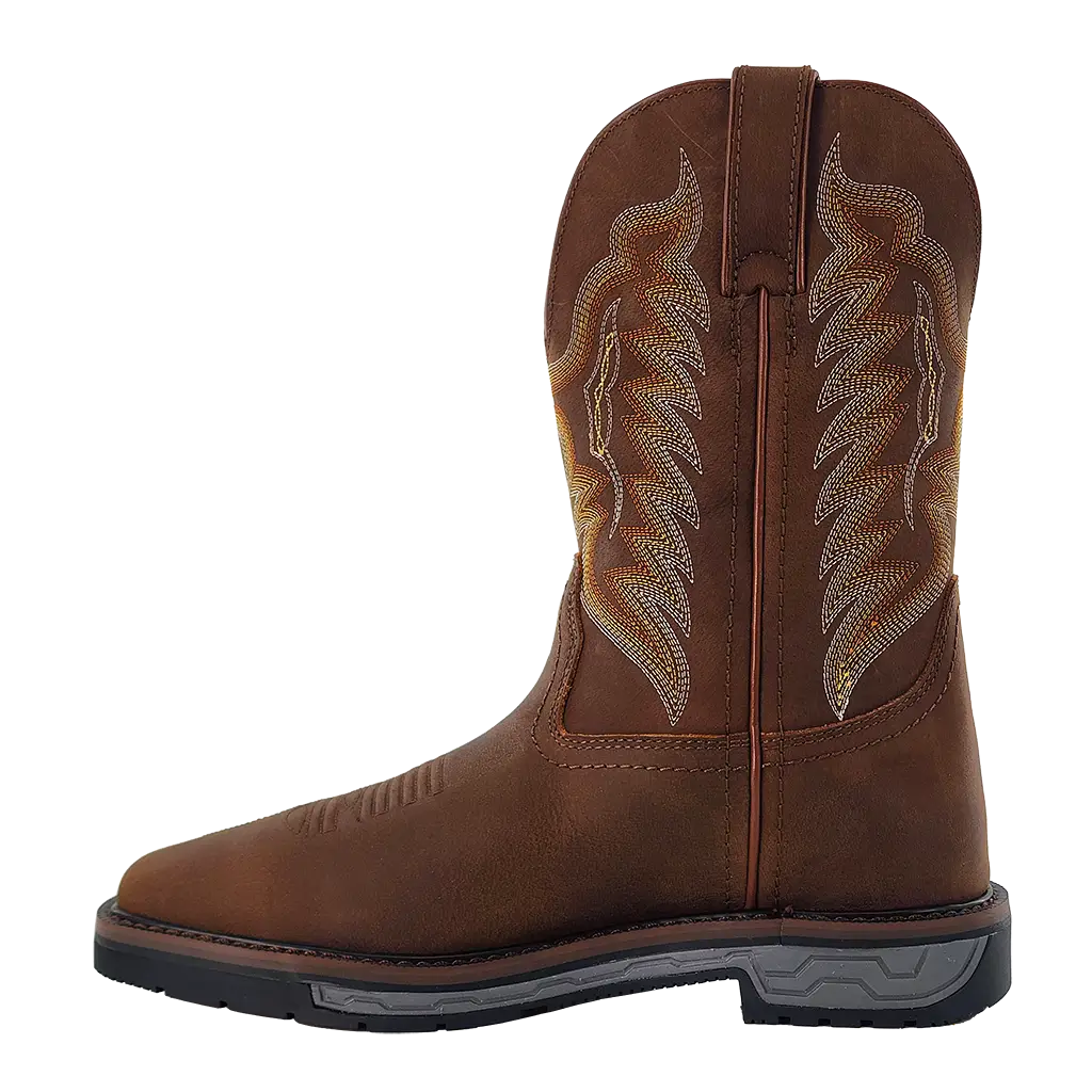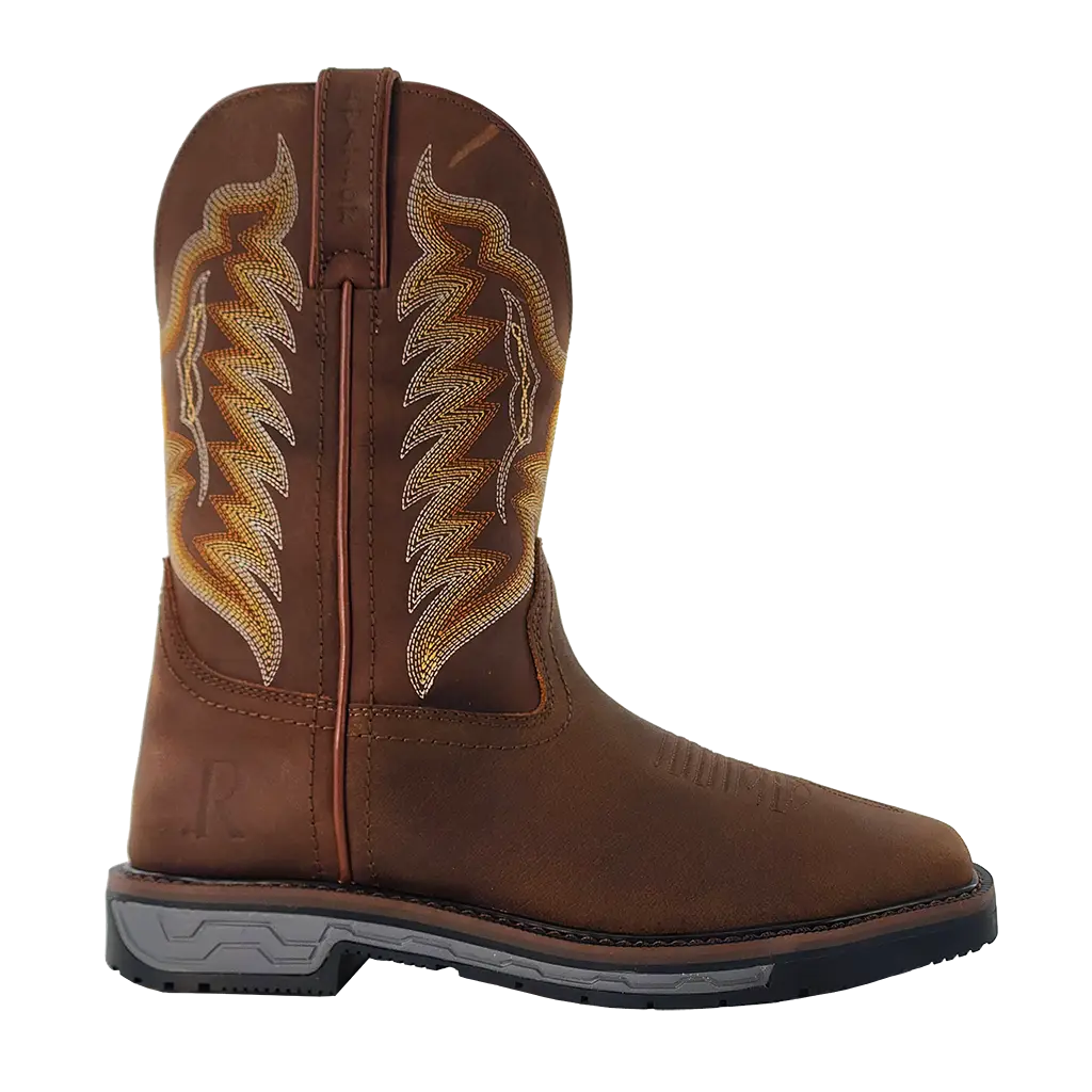R. Watson presents these cowhide wide square toe work boots. These work boots have a 10 row stitch pattern, removable orthotic insole, molded EVA midsole, rubber unit outsole. They are EH, slip and oil resistant. 11″ total in height.
