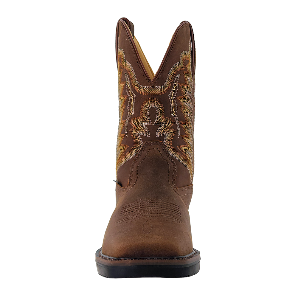 R. Watson presents these cowhide wide square toe work boots. These work boots have a 10 row stitch pattern, removable orthotic insole, molded EVA midsole, rubber unit outsole. They are EH, slip and oil resistant. 11″ total in height.