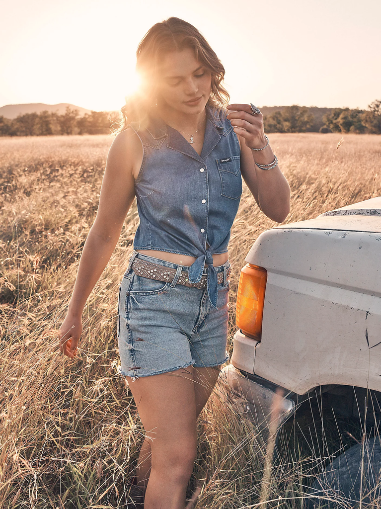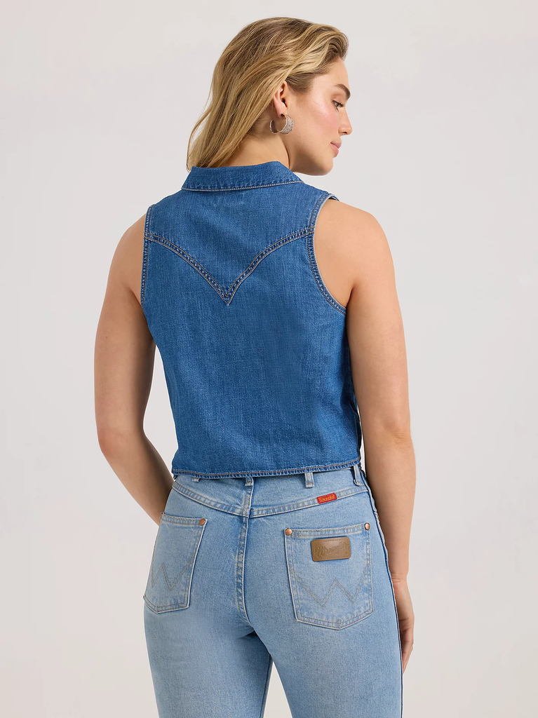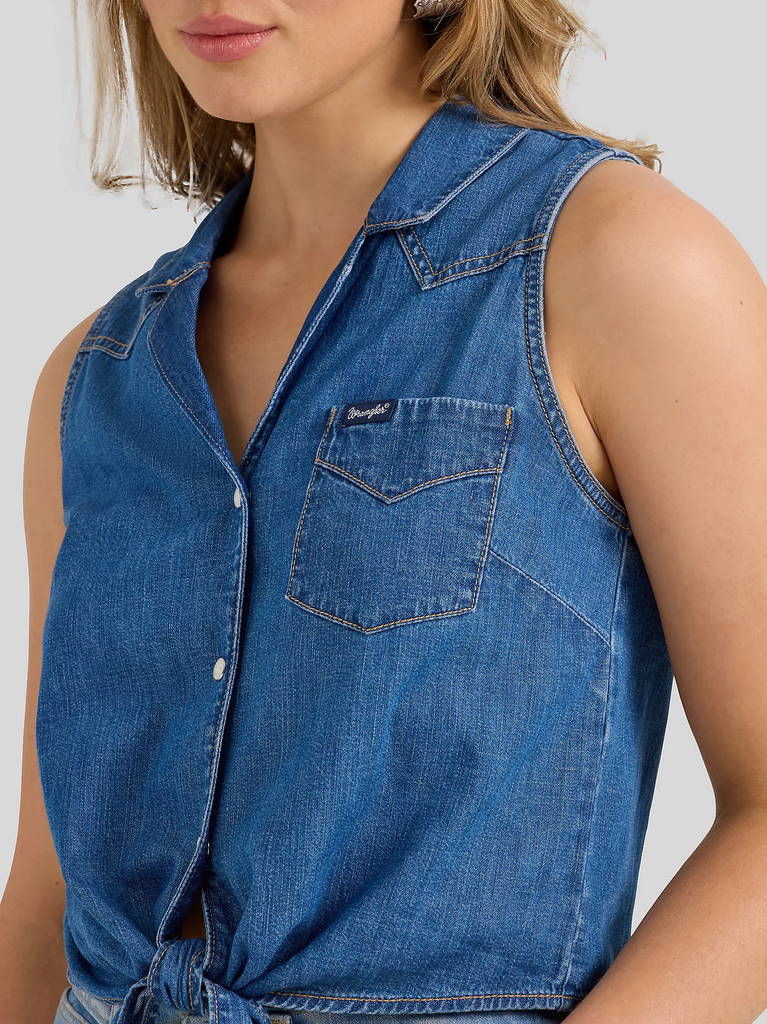 When it's too warm to wear your go-to western snap shirt, our women's denim sleeveless tie front shirt will be the next best option. This classic summertime staple is crafted from cotton for comfort and comes with all the iconic details, including two chest flap pockets with the 'W' embroidery, western front and back yokes, a pointed collar, and a full pearl snap closure. It's cut to the perfect length for wearing with your favorite high-rise Wrangler® jeans or shorts. Plus, it ties at the waist for a relaxed feel. Finish the look with some turquoise jewelry.